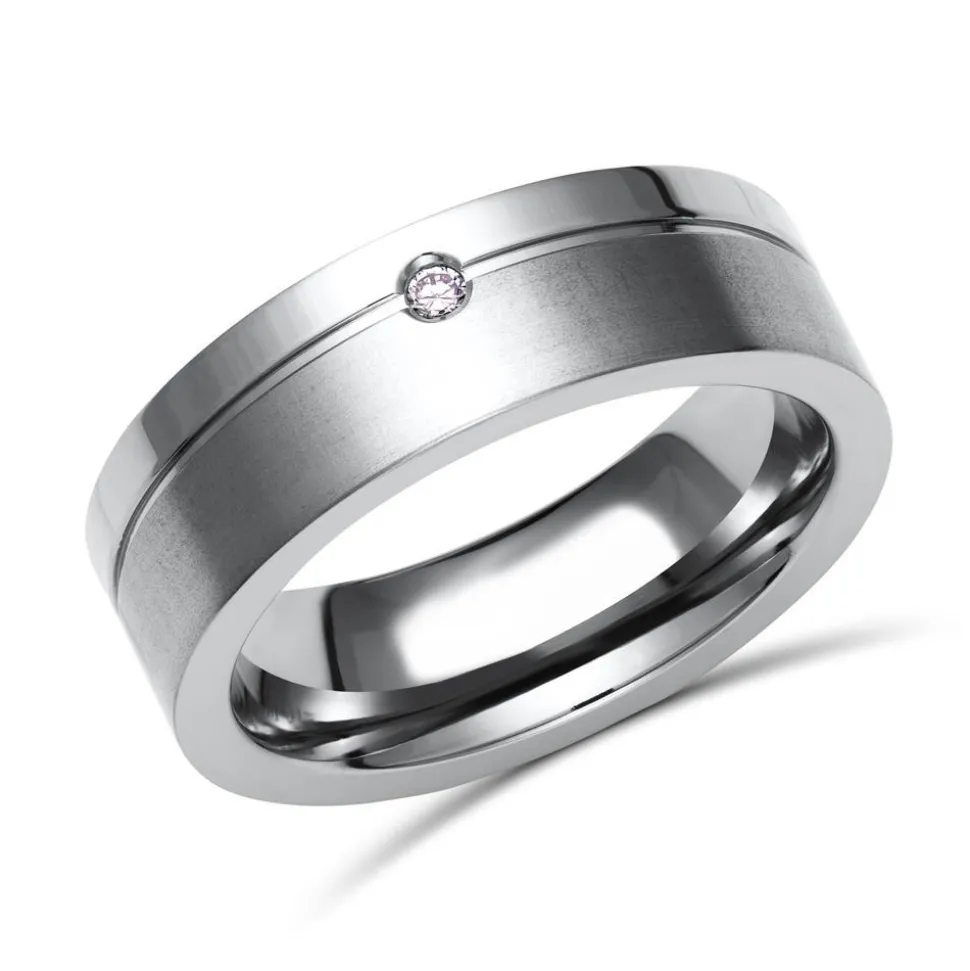 Exklusiver Titanring der Marke Unique Titanium mit Diamant 0,02 ct. (Brillantschliff), teilpolierter Oberfläche und Glanzrille. Der Ring ist bombiert (von Innen abgerundet) und daher angenehm zu tragen.
