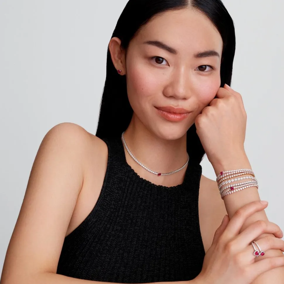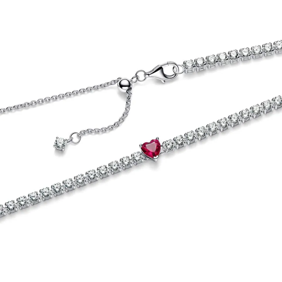 Diese Damenkette ist wunderschön. Sie ist aus recyceltem Sterlingsilber gefertigt und mit strahlenden Zirkoniasteinen besetzt. In die Mitte der Kette ist dabei ein roter Schmuckkristall in Herzform eingearbeitet, der für einen besonderen Blickfang sorgt. Neben dem Karabinerhaken verfügt die Kette über einen Zugverschluss, durch den die Länge reguliert werden kann.
