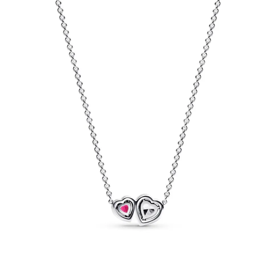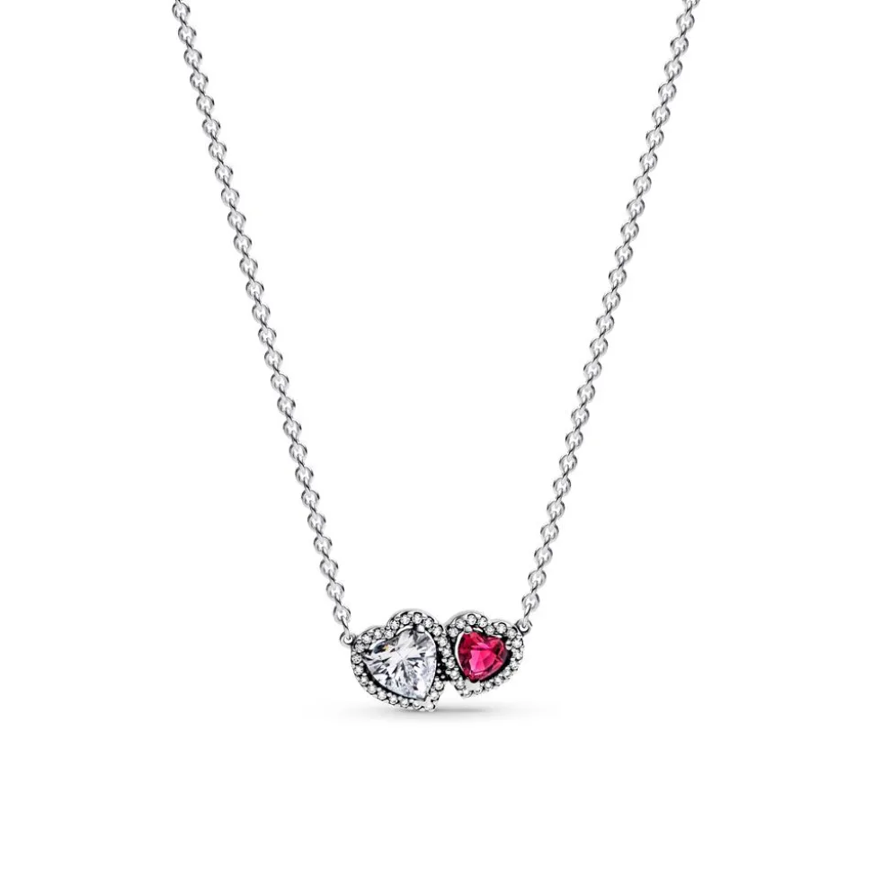 Diese Damenkette ist wunderschön. Gefertigt aus recyceltem Sterlingsilber, bezaubert sie mit ihrem eingearbeiteten Schmuckelement. Dieses umfasst zwei nebeneinander angeordnete Herzen, die mit je einem herzförmigen Zirkonia und einem roten Schmuckkristall in Herzform besetzt sind. Eingerahmt werden beide Herzen von kleinen runden Zirkonia. Die Kette ist durch die Zwischenösen längenverstellbar und wird mit einem Karabiner verschlossen.