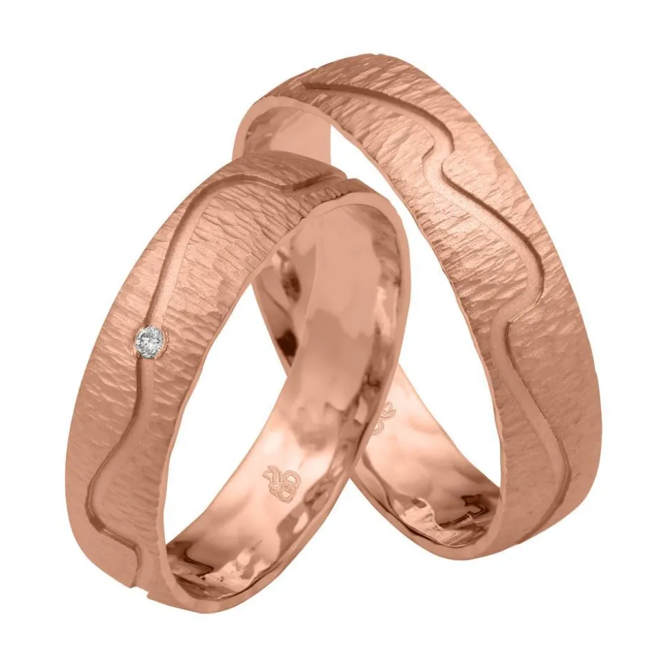 Mit einem ausgefallenen Design begeistern diese Trauringe aus Roségold. Ihre Ringschienen besitzen eine strukturierte Relief-Oberfläche mit vertikaler Ausrichtung, die jeweils von einer geschwungenen Rille in sandmatter Optik geziert wird. Für ein angenehmes Tragegefühl sorgt die leichte Bombierung der Ringe. Der Damenring ist mit einem funkelnden Diamanten im Brillantschliff (ca. 0,01 ct.) besetzt. Dieser ist in der sandmatten Rille eingefasst und verfügt über die Farbe „Top Wesselton“. Weiterhin zeichnet er sich durch die Reinheit „small inclusions“ und einen konfliktfreien Ursprung aus. Die Ringe sind Teil der Rauschmayer Kollektion „First Modern Love“. Auf Wunsch kann unser Gravurteam noch eine individuelle Gravur auf der Innenseite vornehmen.