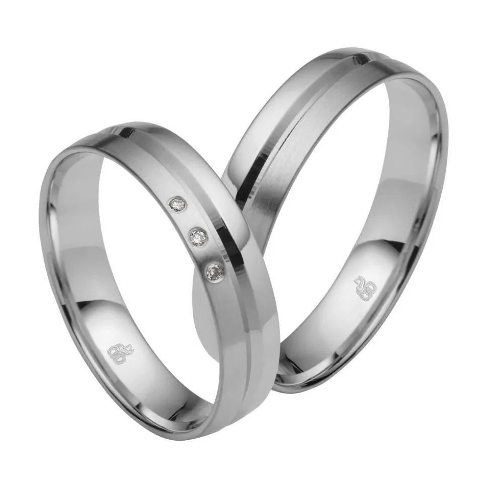 Ein formschönes Paar – das sind diese Trauringe, die wahlweise in Weißgold (375er, 585er und 750er), Platin (600er und 950er) sowie Palladium (500er und 950er) und Permanent White (585er Weißgold mit einem Palladiumanteil von 14 Prozent) zur Auswahl stehen. Ihre Ringschienen sind teils poliert und teils feinmattiert und eine breite Rille in der Mitte setzt einen modernen Akzent. Für zauberhaftes Funkeln auf dem Damenring sorgen die 3 Brillanten. Sie verfügen über eine Gesamtkaratzahl von ca. 0,015 ct., die Farbe „Top Wesselton“ sowie die Reinheit „small inclusions“. Da wir außerdem großen Wert auf ethische Aspekte legen, beziehen wir unsere Diamanten ausschließlich aus konfliktfreien Quellen. Dank leichter Bombierung (Abrundung weisen die Ringe einen hohen Tragekomfort auf. Sie gehören zur „First Modern Love“-Kollektion von Rauschmayer und können auf Wunsch noch mit einer persönlichen Innengravur versehen werden.