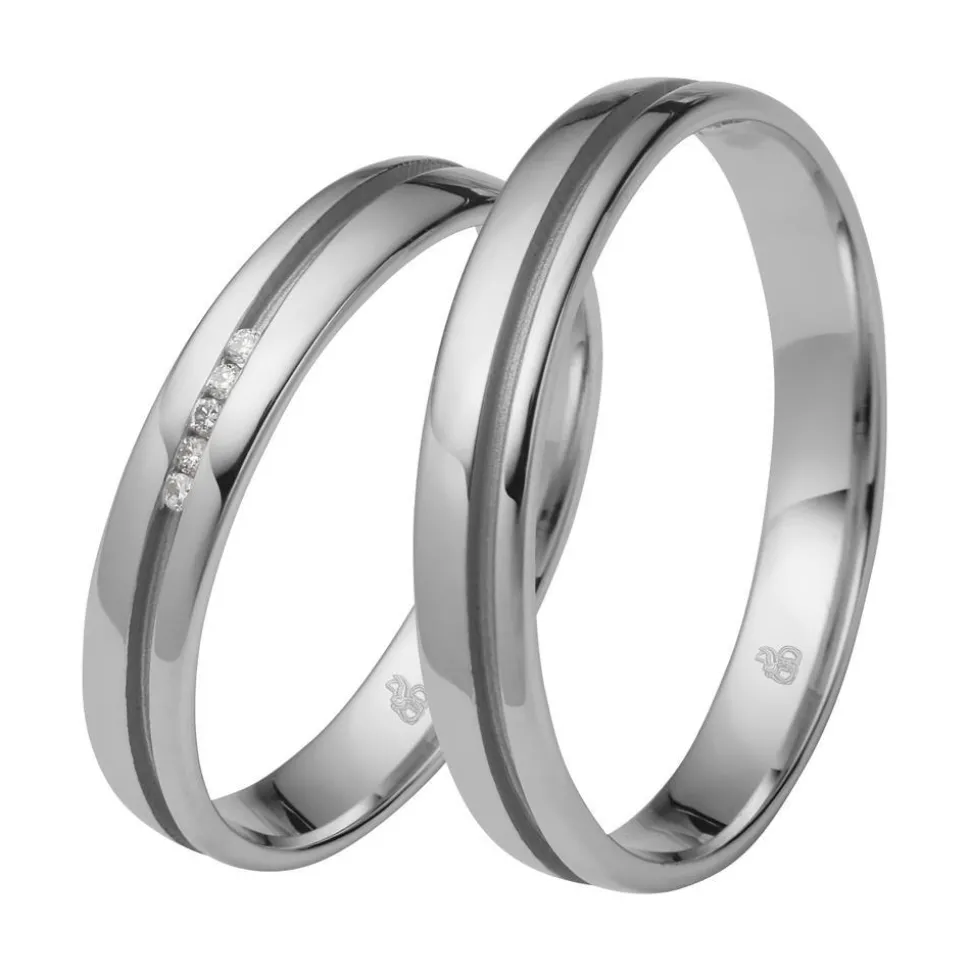 Ein stilvolles Duo – das sind diese Trauringe aus der Rauschmayer-Kollektion „First Modern Love“. Sie sind wahlweise in Weißgold (375er, 585er, 750er), in Platin (600er, 950er), in Palladium (500er, 950er) oder in Permanent White (585er Weißgold mit einem Palladiumanteil von 14 Prozent) erhältlich. Die gewünschte Legierung kann über das Drop-down-Feld ausgesucht werden. Die Trauringe verfügen über polierte Ringschienen, die jeweils von einer sandmatten Vertiefung geziert werden. Die Vertiefung verläuft längs über die Ringschienen und auf dem Damenring befinden sich 5 Brillanten mit insgesamt ca. 0,025 ct. darin. Diese sind nebeneinander angeordnet und zeichnen sich durch eine hohe Qualität aus (Farbe: Top Wesselton, Reinheit: small inclusions). Zudem stammen die Diamanten selbstverständlich allesamt aus konfliktfreien Bezugsquellen. Die Ringe sind leicht bombiert, wodurch ein komfortables Tragegefühl entsteht. Gerne kann unser erfahrenes Gravurteam noch eine persönliche Innengravur hinzufügen.