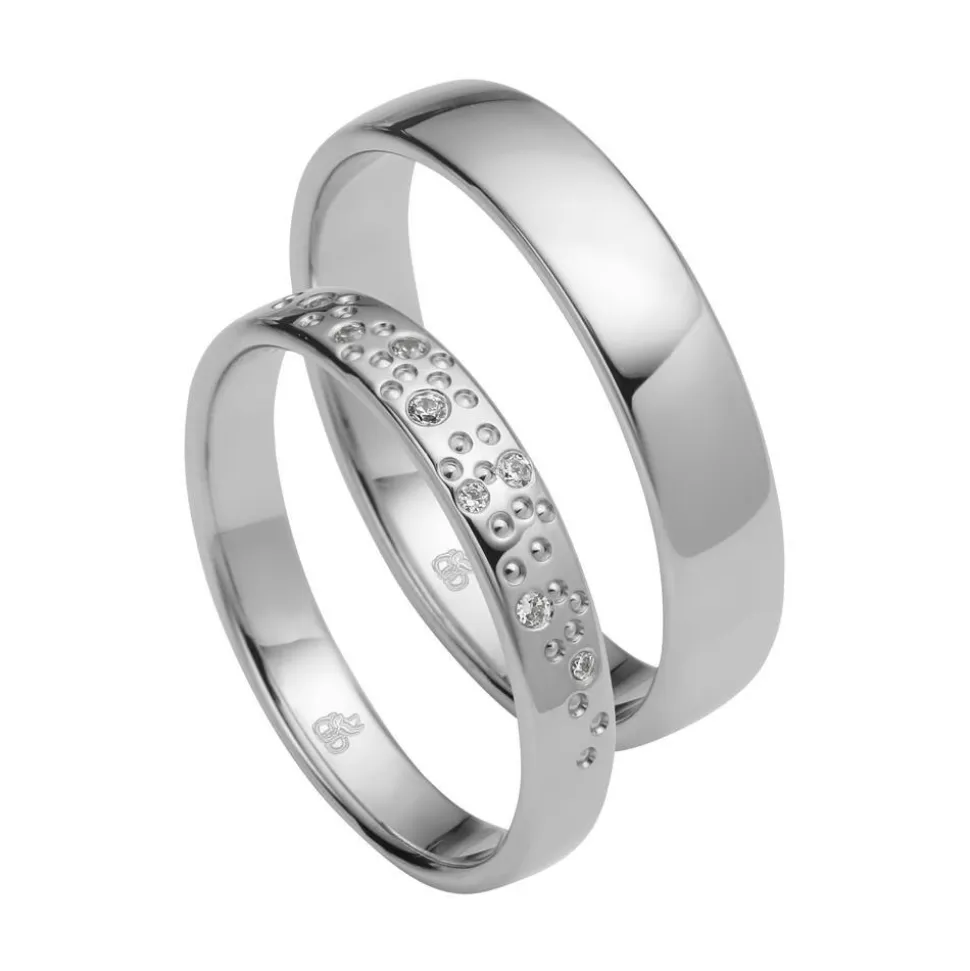 Diese Trauringe aus der Kollektion „First Modern Love“ von Rauschmayer bestechen mit ihrem bezaubernden Aussehen. Da die Ringe in unterschiedlichen Legierungen erhältlich sind, kann die gewünschte Legierung über das Drop-down-Feld ausgewählt werden. Die Auswahl der Legierungen umfasst Weißgold (375er, 585er, 750er), Platin (600er und 950er), Palladium (500er und 950er) oder Permanent White (585er Weißgold mit einem Palladiumanteil von 14 Prozent). Während der Herrenring sich in einem schlichten Design präsentiert, sticht der schmalere Damenring umso mehr hervor. Dieser wird von 8 Diamanten mit insgesamt ca. 0,053 ct. geziert, die gemeinsam mit kreisförmigen Vertiefungen auf der Ringschiene verteilt angeordnet sind. Die Diamanten besitzen alle einen Brillantschliff und zeichnen sich durch eine hohe Qualität aus (Reinheit SI, Farbe TW). Auch ethische Aspekte sind uns wichtig, weshalb unsere Diamanten alle aus konfliktfreien Quellen stammen. Die leichte Abrundung der Ringschienen sorgt für ein komfortables Tragegefühl. Mit einer persönlichen Gravur auf der Innenseite können die Ringe noch eine individuelle Note erlangen.