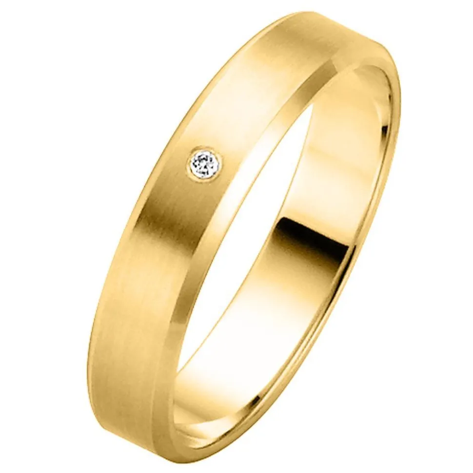 Einmalig schön – das sind diese Trauringe aus der Kollektion „Easy Line – New Generation“. Die Ringe sind aus feinmattem Gold gefertigt und besitzen abgeflachte Außenkanten, die poliert sind. Die Ringe sind innen bombiert und daher angenehm zu tragen. Der Damenring wird noch von einem ca. 0,01 ct. schweren Diamanten geziert. Der Diamant verfügt über einen Brillantschliff und eine gute Qualität (Farbe: W, Reinheit: P2, konfliktfreier Ursprung). Mit einer Gravur auf der Innenseite können die Ringe noch individueller gestaltet werden.