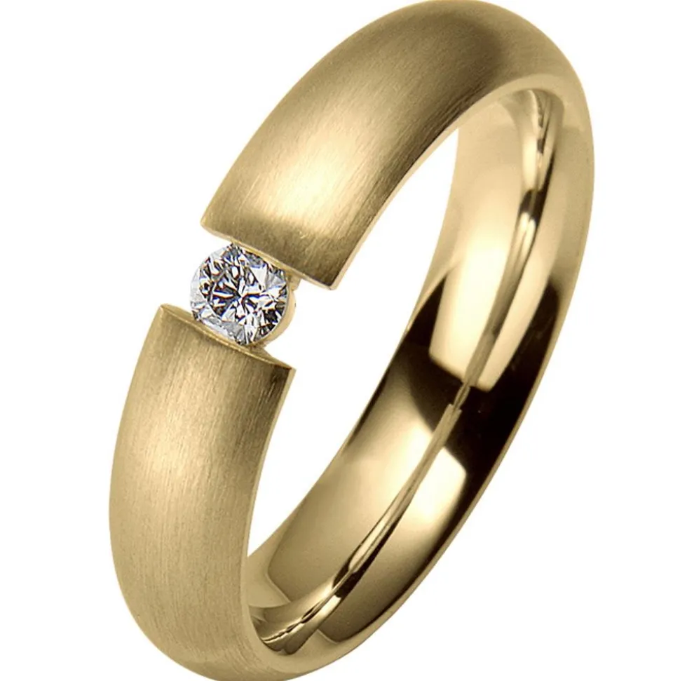 Mit einem stilvollen Design begeistern diese Trauringe aus Gold. Sie stammen aus der „Classic House“-Kollektion von der Firma Rauschmayer. Die Ringe besitzen eine längs-gebürstete Oberfläche und sind innen bombiert (abgerundet), wodurch sie angenehm zu tragen sind. Der Damenring hebt sich besonders durch seinen brillantgeschliffenen Diamanten hervor, der sich in einer Spannfassung befindet. Der Brillant (ca. 0,01 ct.) zeichnet sich durch die Reinheit „small inclusions“ aus und besitzt die Farbe „Wesselton“. Zudem stammt er aus konfliktfreien Quellen. Eine Innengravur kann auf Wunsch hinzugefügt werden.