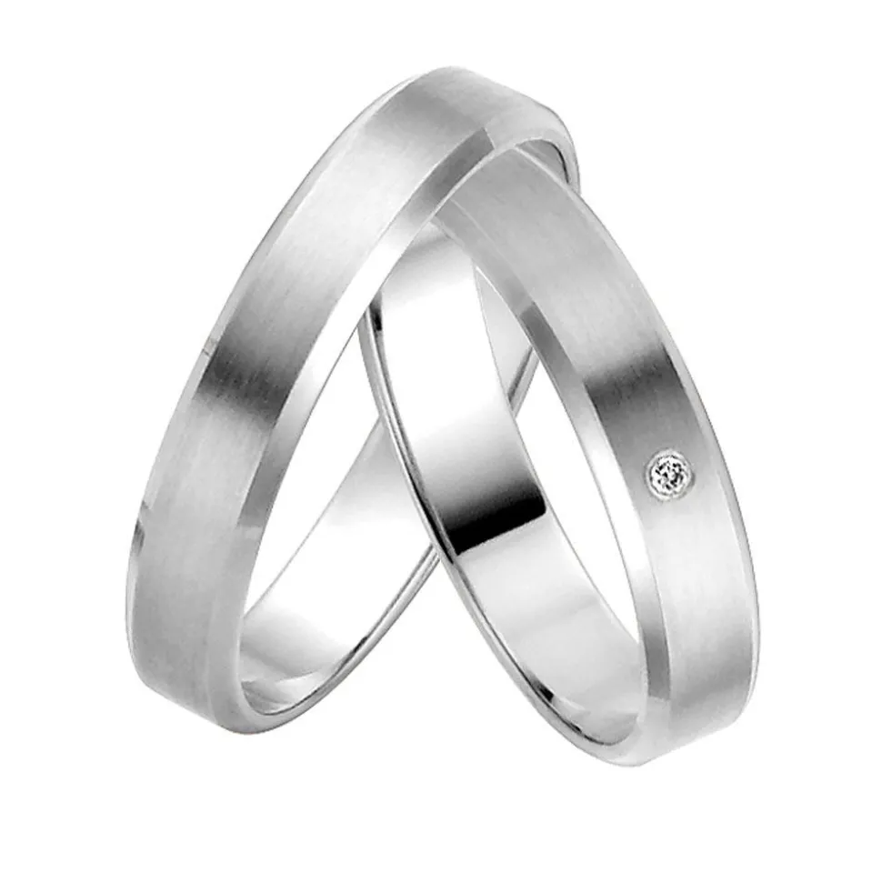 Ein zauberhaft schlichtes Design zeichnet diese Trauringe aus Weißgold aus. Die Ringe aus der „Easy Line – New Generation“-Kollektion von Rauschmayer besitzen eine feinmatte Oberfläche und polierte, abgeflachte Kanten an den Seiten. Auf dem Damenring befindet sich ein funkelnder ca. 0,01 ct. schwerer Brillant. Er stammt aus konfliktfreien Quellen und verfügt über die Farbe „Wesselton“ und die Reinheit „Piqué II“. Durch die innere Abrundung sind die Eheringe sehr angenehm zu tragen. Ihre Innenseite kann auf Wunsch graviert werden.