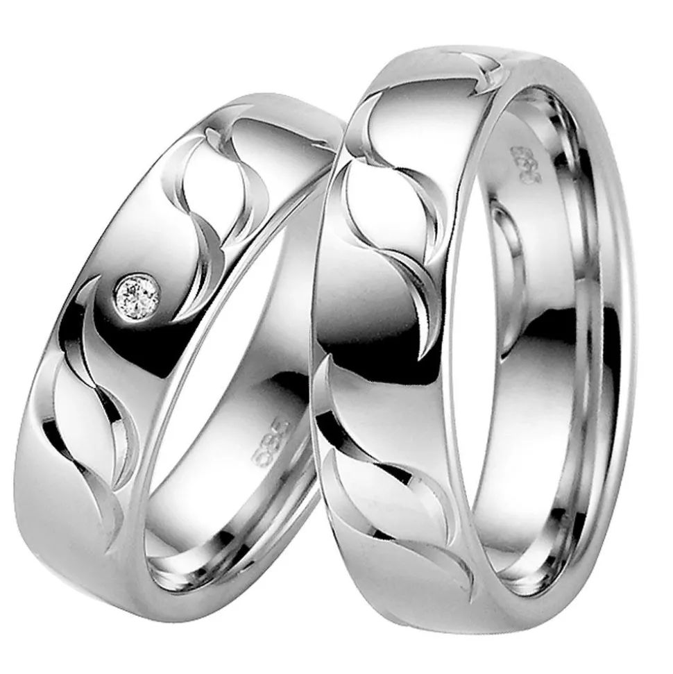 Ansprechend schön – das sind diese Trauringe aus der Kollektion „Elements 2“ von Rauschmayer. Die Ringe sind aus Weißgold gefertigt und besitzen eine polierte Oberfläche, die von geschwungenen Einkerbungen geziert wird. Der Damenring ist mit einem Brillanten besetzt (ca. 0,03 ct., Farbe: Top Wesselton, Reinheit: small inclusions, konfliktfreier Ursprung). Dank der inneren Abrundung sind die Ringe angenehm zu tragen. Ihre Innenseite kann mit einer Wunschgravur versehen werden.