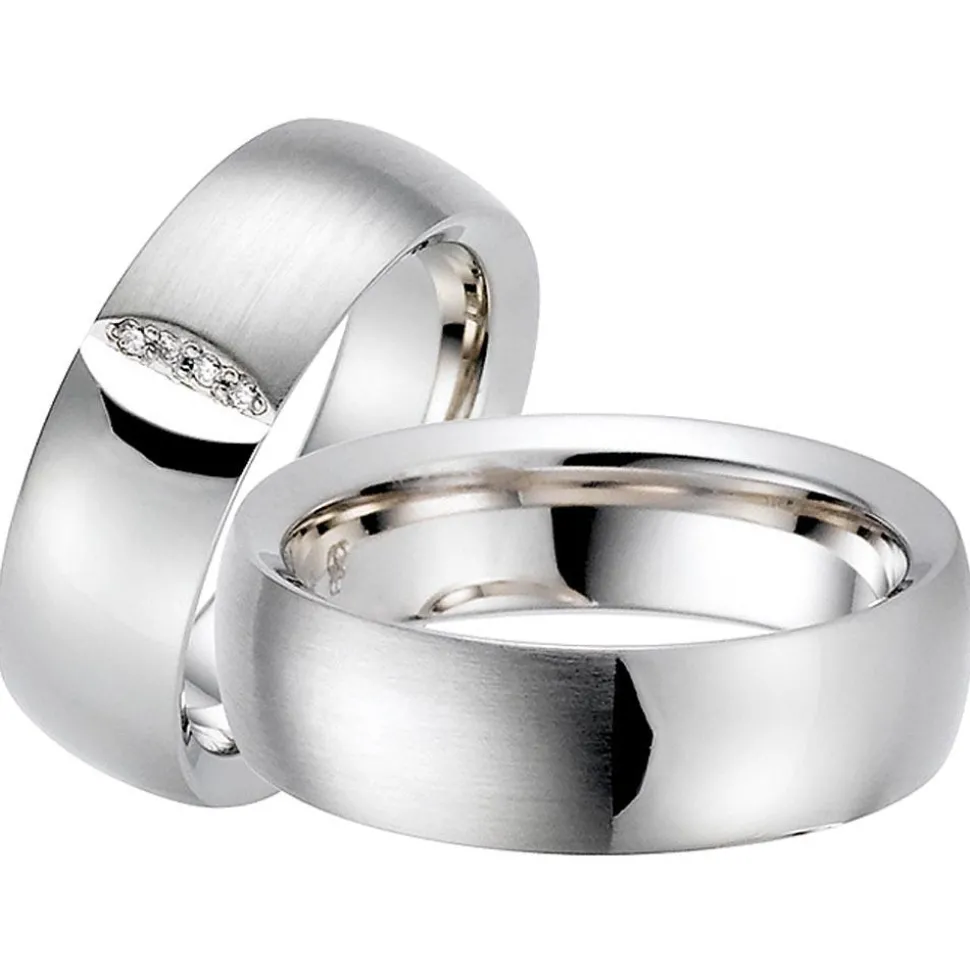 Die zur Hälfte polierte und zur anderen Hälfte längs-mattierte Oberfläche macht diese Trauringe aus Weißgold zu besonderen Blickfängen. Der Damenring wird außerdem von 4 Brillanten mit insgesamt ca. 0,03 ct. geziert. Ihre Reinheit gehört zur Kategorie „small inclusions“ und ihre Farbe ist als „Wesselton“ klassifiziert. Weiterhin wurden alle 4 Diamanten aus konfliktfreien Quellen bezogen. Die Ringe sind innen bombiert und daher sehr angenehm zu tragen. Auf Wunsch kann ihre Innenseite graviert werden.
