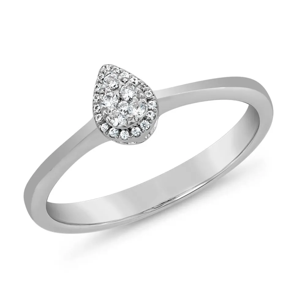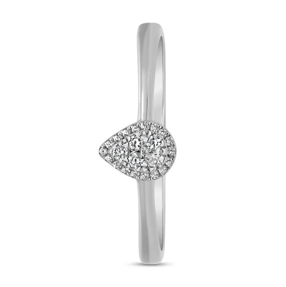 Ein moderner Blickfang – das ist dieser Damenring. Er ist wahlweise in 14- oder 18-karätigem Weißgold oder in 950er Platin erhältlich, das mithilfe der Drop-down-Liste ausgewählt werden kann. Der Ringkopf ist tropfenförmig und in der Mitte mit einem hochgestellten Pavé aus 6 Diamanten versehen. Umrahmt wird das Pavé von 18 weiteren Diamanten. Es befinden sich insgesamt 24 Diamanten mit einer Gesamtkaratzahl von ca. 0,10 ct. auf dem Ring. Alle Diamanten besitzen einen Brillantschliff und zeichnen sich durch die Farbe „Top Wesselton“ und die Reinheit „small inclusions“ aus. Ihr Ursprung ist selbstverständlich konfliktfrei. Gerne versehen unsere erfahrenen Graveure die Innenseite des Rings noch mit einer Gravur.