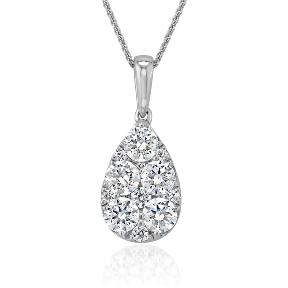Diese Diamantkette aus Weißgold für Damen beeindruckt durch ihren Tropfenanhänger, der mit 12 lab-grown Diamanten besetzt ist. Die Labordiamanten, die zusammen etwa 0,99 ct. wiegen, sind im Brillantschliff gehalten und in einem Pavé angeordnet. Sowohl ihre Farbqualität (River bis Top Wesselton) als auch ihre Reinheit (VVS-VS) sind von besonders hoher Qualität. Auch ihre Härte und Brillanz sind identisch mit der von natürlichen Diamanten, da sie ebenfalls zu 100 % aus Kohlenstoff bestehen. Die Ankerkette ist wahlweise in 585er oder 750er Weißgold erhältlich, was sich bequem über das Drop-down-Menü auswählen lässt. Ein praktischer Karabiner schließt die Kette mit Ankerkettengliederung.