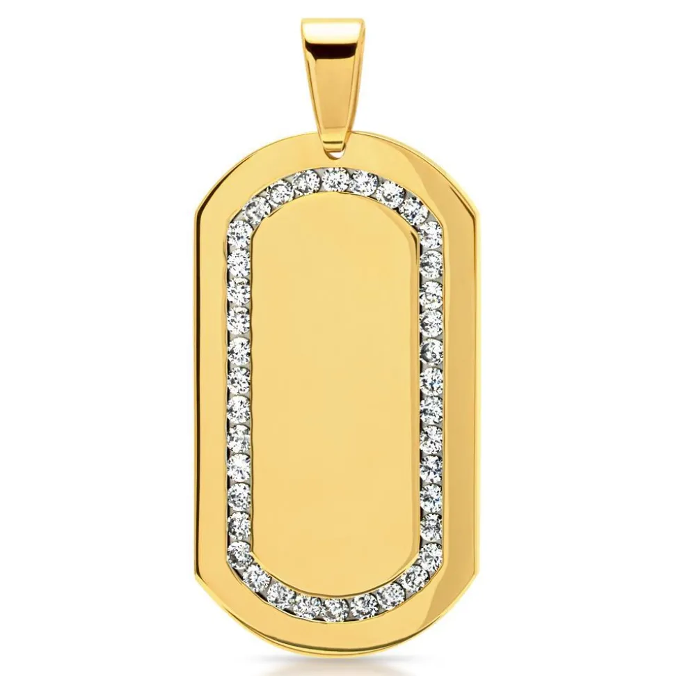 Glänzendes vergoldetes Edelstahl Dogtag mit Zirkoniasteinen. Der Anhänger kann gegen einen Aufpreis graviert werden. Mittels unseres neuen Produkt-Designers haben sie vielfältige Möglichkeiten, kombinieren Sie etwa Grafiken oder auch eigene Bilddateien zu Ihrer Traumkomposition.