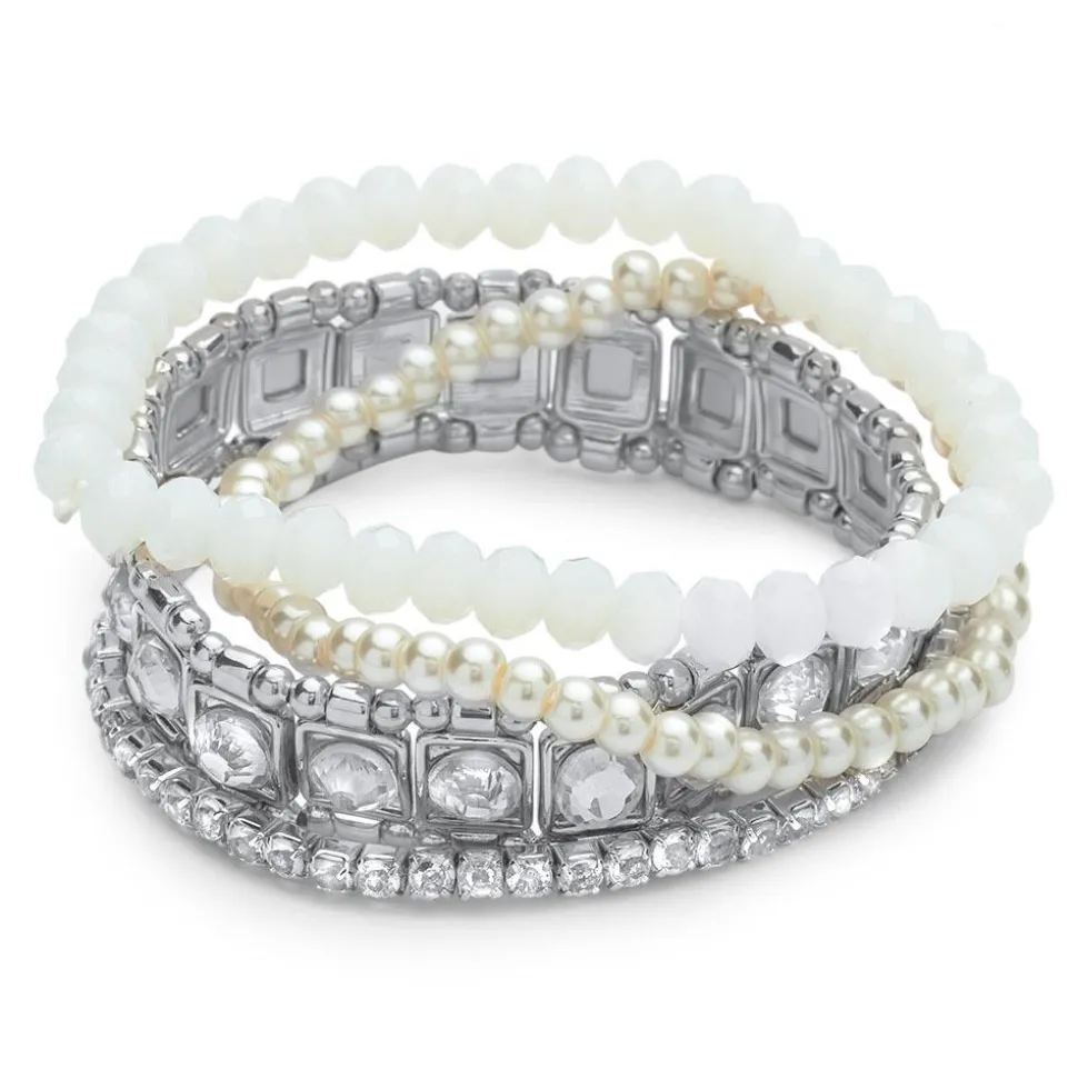 Ein klassisches Perlenarmband geht bei diesem Set eine funkelnde Verbindung mit drei weiteren Modeschmuck-Armbändern ein. Besondere Eyecatcher sind dabei die transparenten Schmucksteine mit quadratischer Fassung, die auf dem breitesten Armband funkeln. Die Armbänder sind nicht fest miteinander verbunden. Sie können daher unterschiedlich kombiniert werden und lassen sich sowohl gemeinsam als auch einzeln tragen. Weil die einzelnen Schmuckelemente auf elastisches Nylon aufgefädelt sind, passt sich der Modeschmuck verschiedenen Handgelenken an.