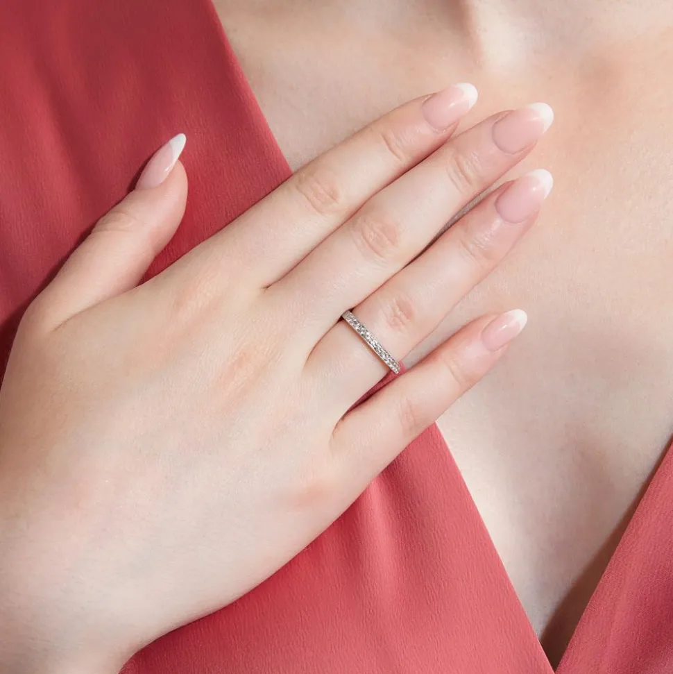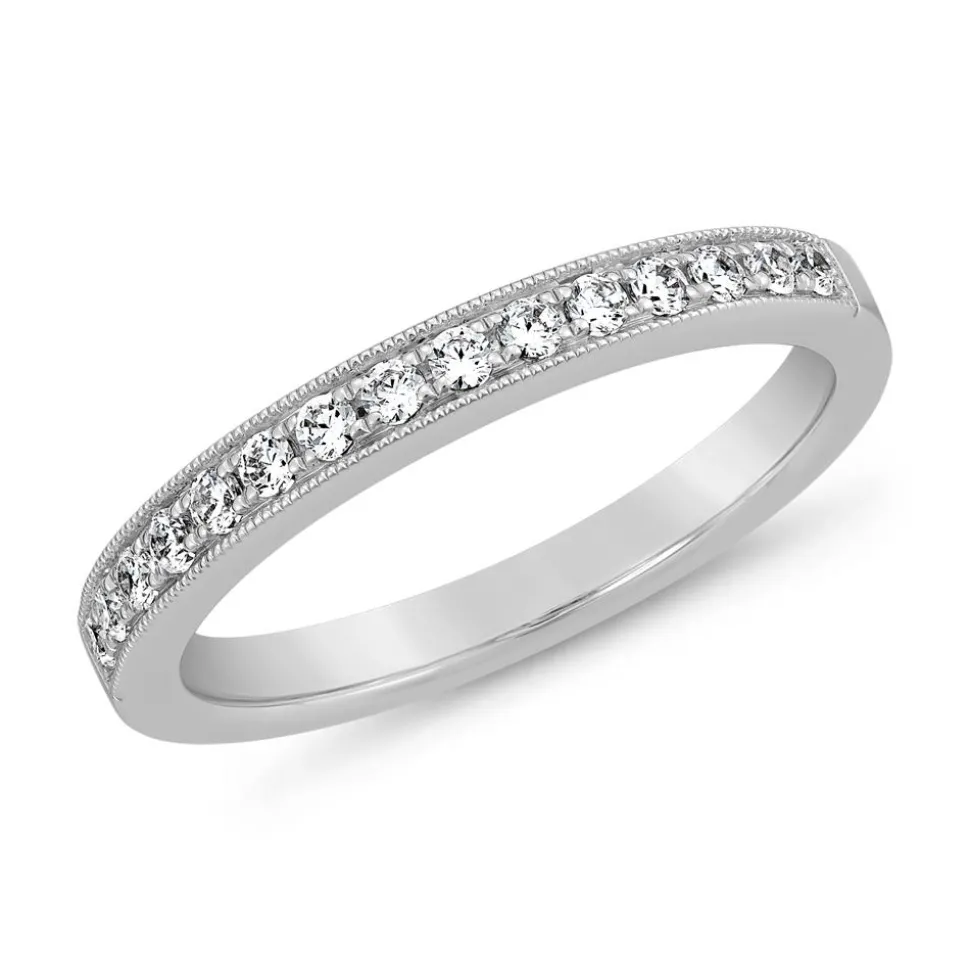 Das stilvolle Erscheinungsbild dieses Diamantrings überzeugt. Wahlweise aus 14-karätigem oder 18-karätigem Weißgold oder aus 950er Platin gefertigt, kann das bevorzugte Material über die Drop-down-Liste ausgewählt werden. Im vorderen Bereich des Rings sind 15 Diamanten platziert, die von Krappen gehalten werden und von einem perlierten Rahmen umgeben sind. Die 15 Diamanten im Brillantschliff verfügen insgesamt über ca. 0,24 ct. und zeichnen sich durch eine hohe Qualität aus (Farbe: TW, Reinheit: SI). Ihre Herkunft ist selbstverständlich konfliktfrei. Die Innenseite des Rings kann auf Wunsch individuell graviert werden.