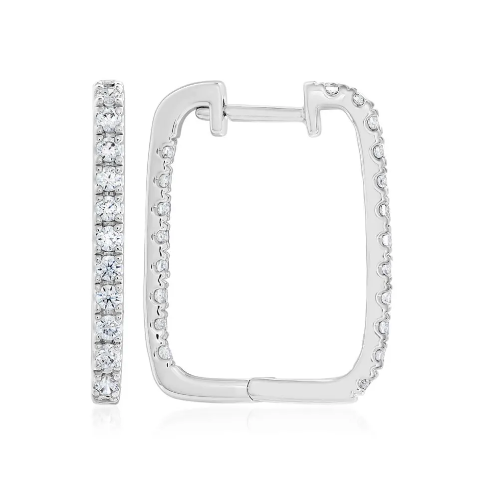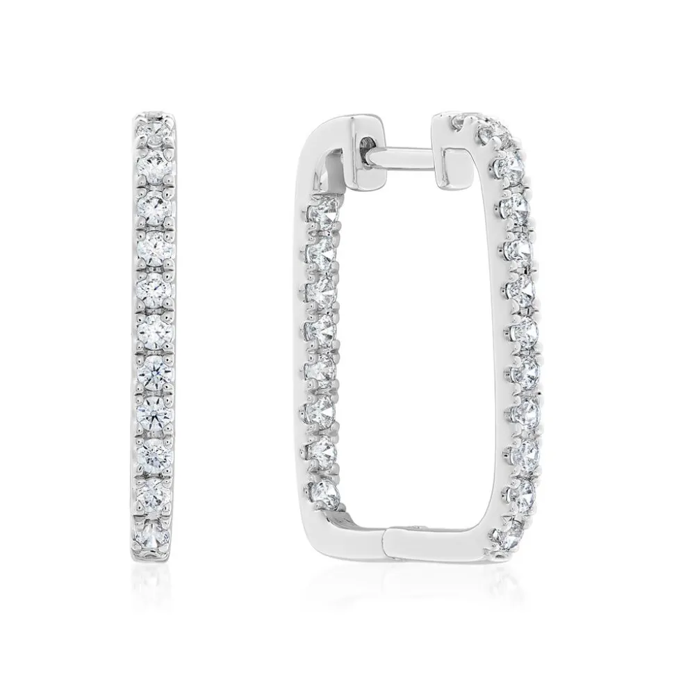 Ein modernes Design und exklusive Materialien – das macht diese Creolen für Damen aus. Sie können wahlweise in 585er oder 750er Weißgold oder 950er Platin bestellt werden. Bitte im Drop-down-Feld auswählen. Der Ohrschmuck besitzt eine moderne eckige Form und ist auf der vorderen Außenseite und hinteren Innenseite mit Brillanten (insgesamt 40; ca. 0,70 ct.) besetzt. Die Farbe dieser fällt in die Kategorie Top Wesselton und die Reinheit ist mit SI klassifiziert. Wir beziehen unsere Diamanten selbstverständlich aus konfliktfreien Quellen.
