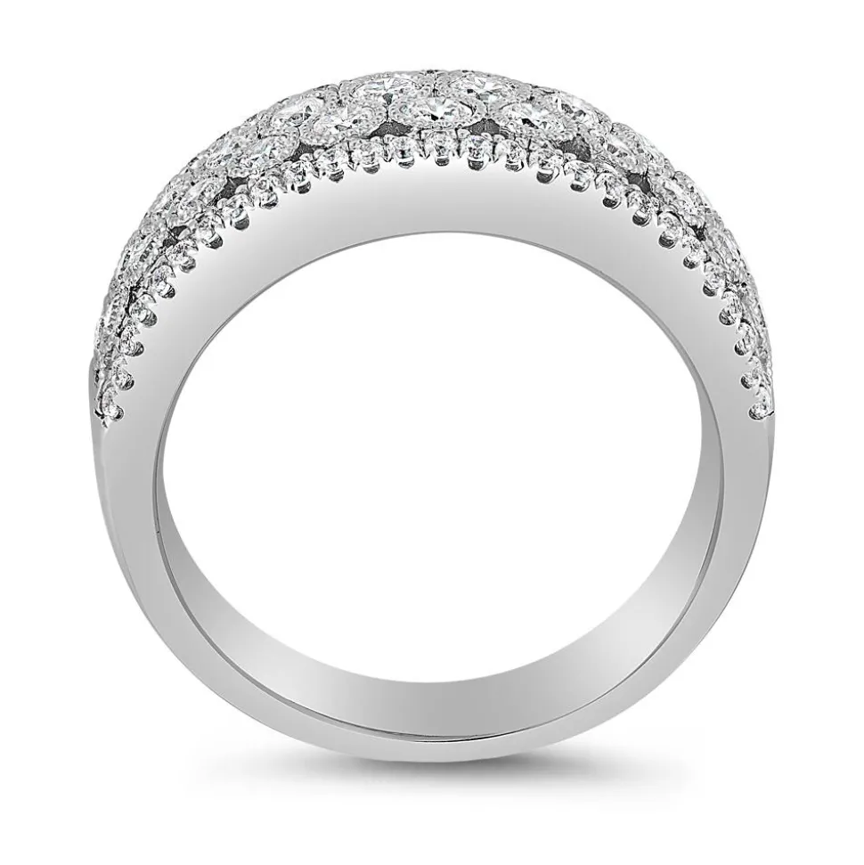 Ein auffallendes Schmuckstück – das ist dieser Ring für Damen. Wahlweise aus 585er/750er Weißgold oder 950er Platin gefertigt, bezaubert er mit seinem funkelnden Steinbesatz auf der oberen Hälfte der Ringschiene. Beide Außenseiten sind dabei mit 54 lab-grown Brillanten (insgesamt ca. 0,27 ct.) besetzt. Die Mitte strahlt durch 23 weitere, unterschiedlich große brillantgeschliffene lab-grown Diamanten, die insgesamt über ca. 0,61 ct. verfügen und mit einer Milgrain-Perlierung umrandet sind. Alle Diamanten weisen dabei die Farbe D-F und die Reinheit VVS-VS auf. Die Diamanten aus dem Labor bestehen zu 100 % aus Kohlenstoff. Wie auch natürliche Diamanten verfügen sie über die gleiche Härte und Brillanz. Die Auswahl der gewünschten Legierung erfolgt über das Drop-down-Menü. Ebenso kann ein Gravurwunsch auf der Innenseite hinzugefügt werden.