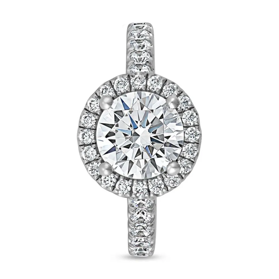 Voller Stilsicherheit überzeugt dieser Halo-Ring für Damen. Aus Weißgold (14 Karat oder 18 Karat) sowie Platin (950er) gefertigt, bezaubert er mit einem unvergleichlichen Funkeln. Dieses ensteht durch den zentralen Diamanten (ca. 1,50 ct.), der von einem Kranz aus weiteren Diamanten umgeben ist. Die Ringschiene ist fast vollständig mit eingelassenen Diamanten bedeckt. Die 42 kleinen Brillanten mit insgesamt ca. 0,64 ct. besitzen alle die Farbe „Top Wesselton“ und die Reinheit „small inclusions“. Auch stammen alle Diamanten aus konfliktfreien Quellen. Als Nachweis über die Herkunft, Echtheit und Qualität des Hauptsteins dient das Zertifikat des renommierten Gemological Institute of America (GIA). Auf Wunsch kann der Ring auf der Innenseite graviert werden. Über das Drop-down-Feld lässt sich die Legierung auswählen.