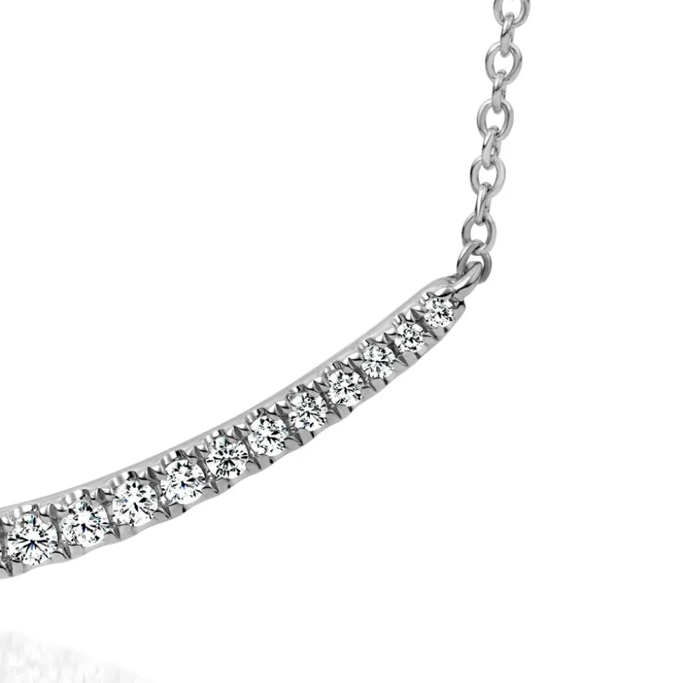 Diese Diamantkette für Damen ist ein stylischer Begleiter. Sie ist entweder in 14-karätigem oder in 18-karätigem Weißgold erhältlich. Über das Drop-down-Menü kann die gewünschte Legierung der Kette ausgewählt werden. Sie besitzt eine Ankerkettengliederung und trägt ein gebogenes Schmuckelement, welches in die Kette eingearbeitet ist. Insgesamt 29 lab-grown Diamanten (ca. 0,31 ct. gesamt) zieren das Schmuckelement. Die brillantgeschliffenen Diamanten zeichnen sich durch die Farbe „River“ bis „Top Wesselton“ aus und verfügen über eine hohe Reinheit aus der Kategorie „very, very small inclusions“ bis „very small inclusions“. Die Diamanten stammen aus dem Labor und bestehen wie natürliche Diamanten zu 100 % aus Kohlenstoff. Auch ihre Härte und ihre Brillanz unterscheiden sich nicht von herkömmlichen Diamanten. Die Damenkette besitzt einen Karabiner und kann in der Länge verstellt werden.