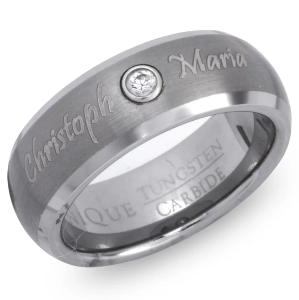 Exklusiver Wolframring, 7mm breit, mit teilpolierter Oberfläche besetzt mit einem Zirkonia. Der Ring ist bombiert (von Innen abgerundet) und daher angenehm zu tragen. Der Ring kann kostenlos mit einer Lasergravur versehen werden.