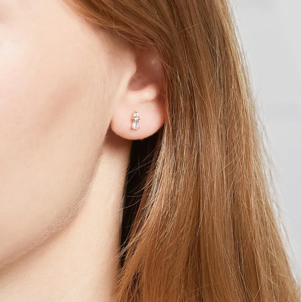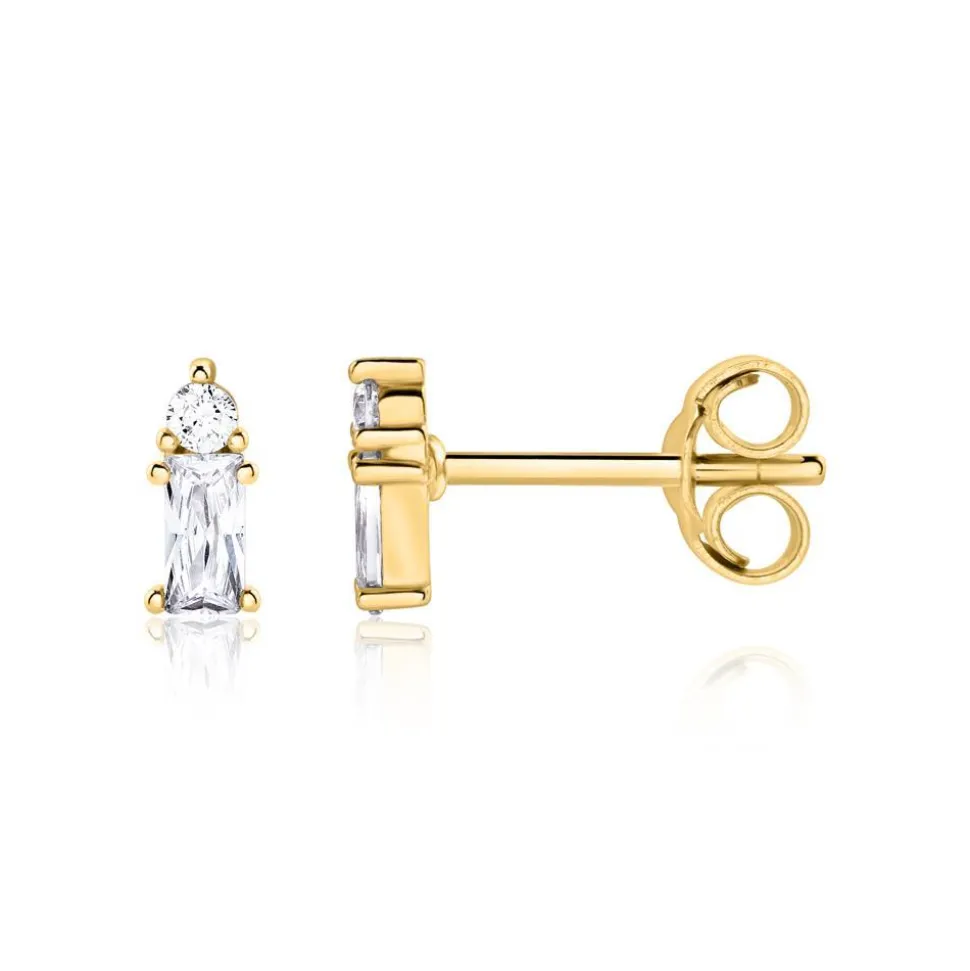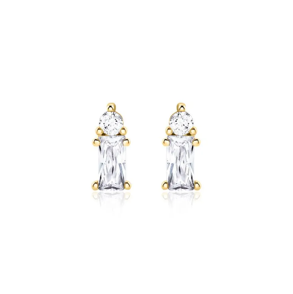 Absolut zeitlos – das sind diese Ohrstecker für Damen. Sie bestehen aus vergoldetem Sterlingsilber mit je einem runden Zirkonia und einem weiteren im Baguetteschliff.