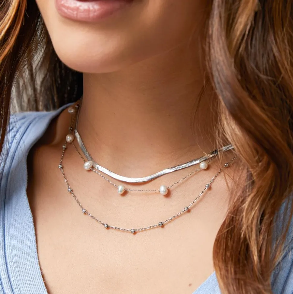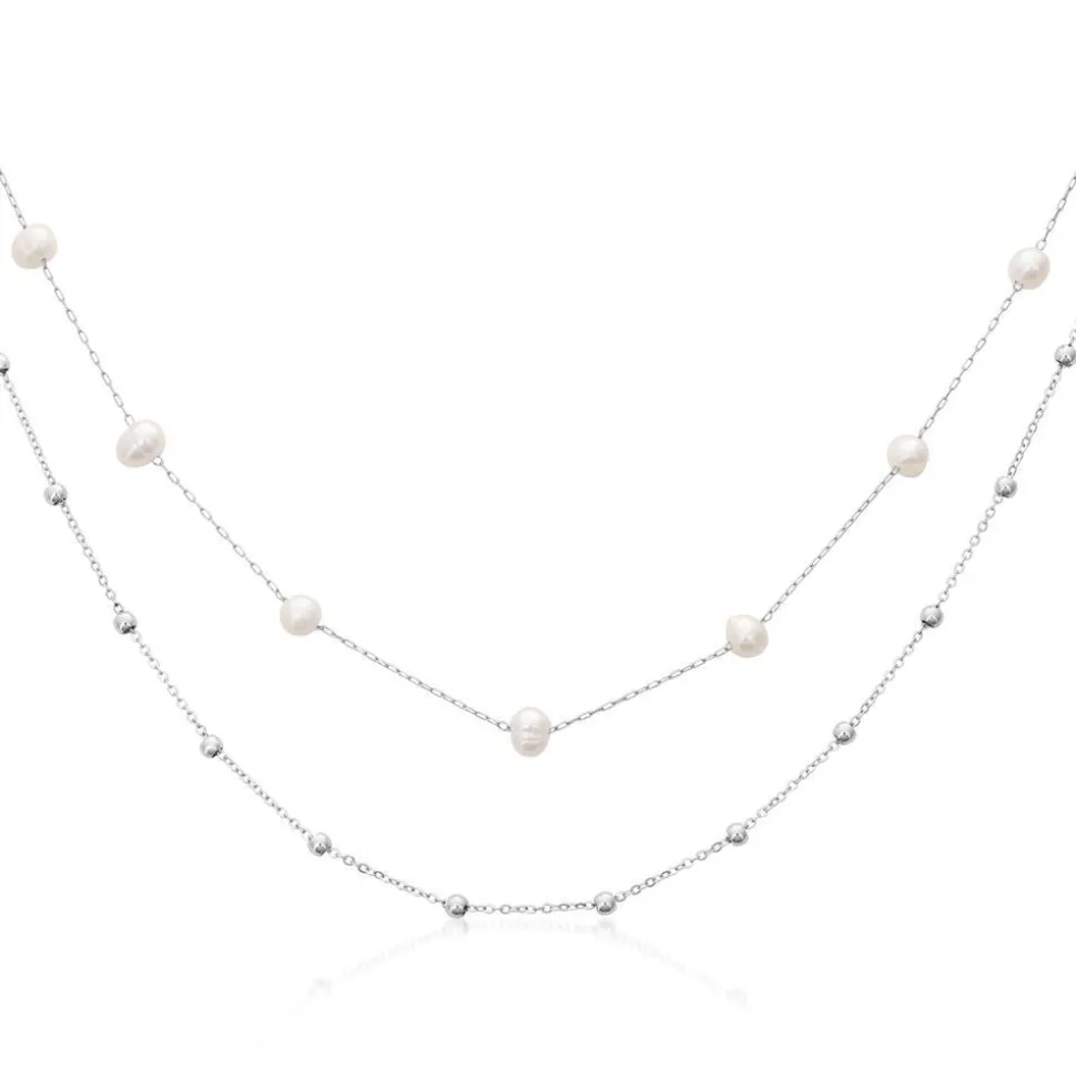 Bezaubernd elegant – das ist diese Layerkette für Damen aus Edelstahl. Sie besteht aus zwei Kettenreihen: die kürzere wird von organisch-geformten Süßwasserperlen geziert und die längere besitzt kleine Edelstahlkugeln. Die Halskette kann in der Länge verstellt werden und wird mit einem Karabiner geschlossen. Das runde Plättchen an der Verlängerungskette kann graviert werden.