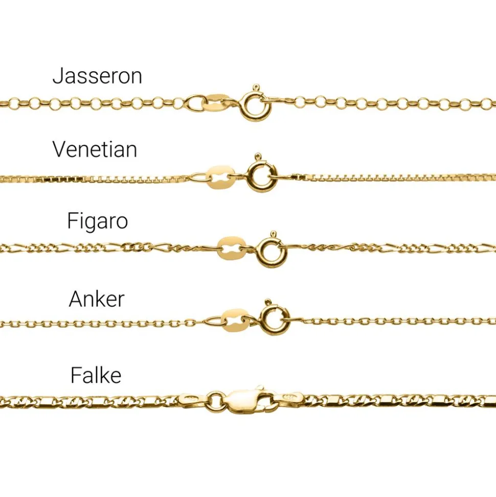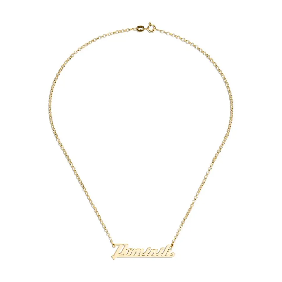 Ein stylisher Eyecatcher – das ist diese Kette. Sie ist aus 585er Gold gefertigt und kann mit einem frei wählbarem Namen oder Begriff versehen werden, welcher dann schwungvoll unterstrichen ist. Auch bei der Kettenart gibt es verschiedene Auswahlmöglichkeiten: