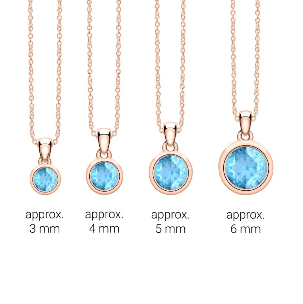 Edel und modern – das ist dieser Kettenanhänger aus 585er Roségold. Highlight ist der zargengefasste Blautopas (Qualität: Swiss Blue) im Brillantschliff. Hierbei stehen verschiedene Steingrößen (-gewichte) für den Steinbesatz zur Verfügung. Bitte Wunschgröße auswählen.