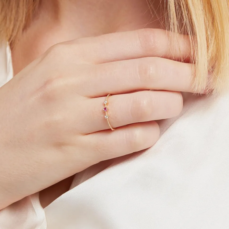 Traumhaft feminin – Das ist dieser Damenring aus 585er Gold mit 1 Rubin (ca. 0,04 ct.) und 2 Diamanten (ca. 0,02 ct.). Die Farbe der Steine ist klassifiziert als Feines Weiß (Top Wesselton) und die Reinheit fällt in die Kategorie SI (small inclusions). Wir legen bei unserem Diamantschmuck nicht nur Wert auf eine exzellente Qualität, sondern auch auf ethische Aspekte. Deshalb stammen unsere Diamanten ausschließlich aus konfliktfreien Quellen