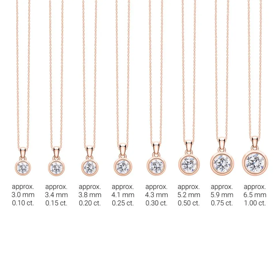 Diese Halskette aus 14-karätigem Roségold begeistert mit ihrer Exklusivität und besitzt als Blickfang einen Diamantanhänger. In einer Zargenfassung sitzt ein lab-grown Diamant im Brillantschliff. Dieser steht in verschiedenen Größen zur Verfügung. Genauso wie natürliche Diamanten verfügen die im Labor produzierten über eine überragende Härte, eine hohe Qualität und ein zauberhaftes Funkeln (Feuer). Der Vorteil solcher Diamanten liegt jedoch in ihrer umweltfreundlichen Produktion, die keinen Diamantabbau erfordert. Alle wichtigen Eigenschaften der Diamanten sind in dem Brilladia-Zertifikat sowie dem IGI-Zertifikat (für Diamanten ab ca. 0,30 ct.) aufgeführt. Die filigrane Ankerkette wird mit einem Karabiner geschlossen. Die Qualität für das jeweilige Steingewicht der lab-grown Diamanten ist in der nachfolgenden Tabelle zu finden.
