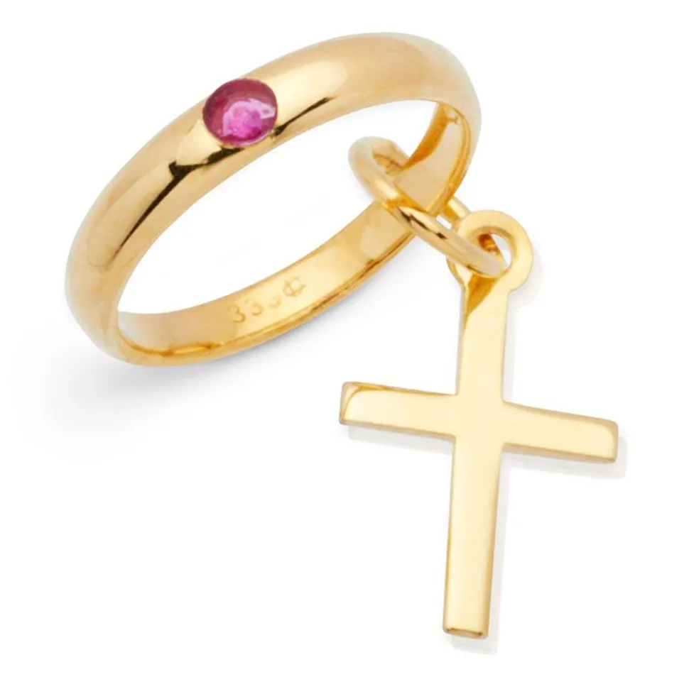 Diese wunderschöne Taufkette besteht aus 8-karätigem Gold. An der Panzerkette befindet sich ein Kreuzanhänger, der einen Taufring hält. Der Taufring wird von einem Rubin geziert.