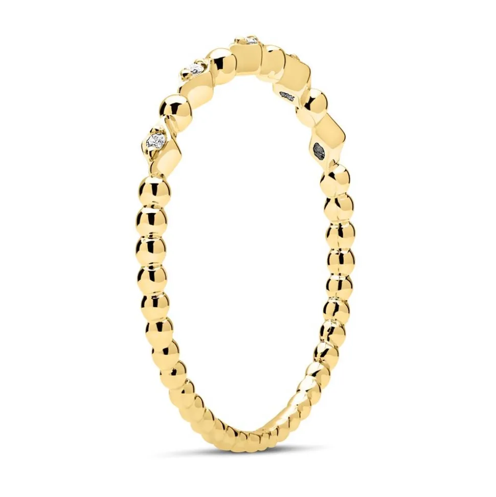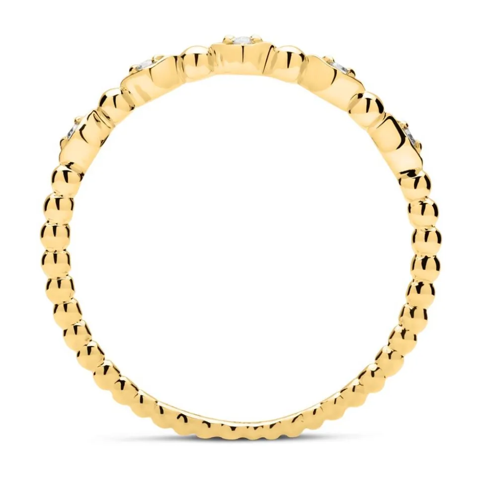 Der handgearbeitete Ring besitzt neben der exquisiten Qualität auch ein raffiniertes Design, welches ihm eine moderne Ausstrahlung verleiht. In die kugelförmige Ringschiene aus hochglanzpoliertem 750er Gold sind rautenförmige Zierlemente eingearbeitet, die von 5 brillantgeschliffenen Diamanten (ca. 0,03 ct.) in Körnerfassung geziert werden. Die Farbe der verarbeiteten Diamanten ist klassifiziert als Feines Weiß (Top Wesselton) und die Reinheit der Steine fällt in die Kategorie SI (small inclusions). Ihr weißes Funkeln bildet einen angenehmen Kontrast zum edlen Glanz des Gelbgoldes. Für uns ist es selbstverständlich, dass wir unsere Diamanten ausschließlich aus konfliktfreien Quellen beziehen.