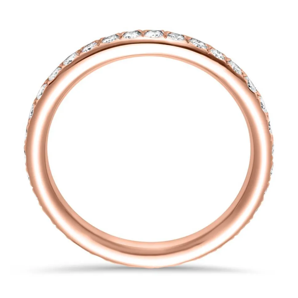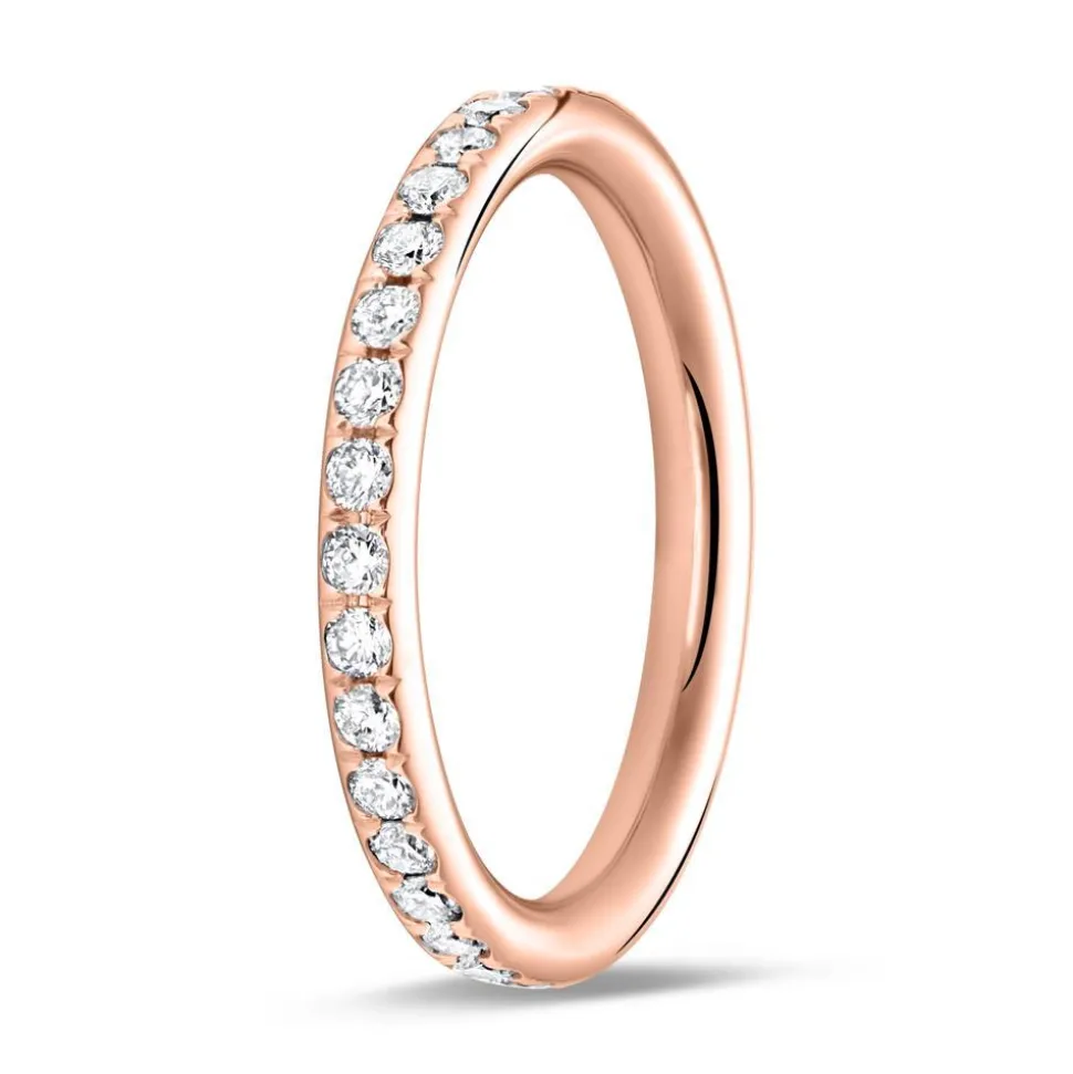 Eternity-Ringe werden auch Memoire-Ringe genannt. Sie sind durch ihr zurückhaltendes Design äußerst beliebt und werden niemals aus der Mode kommen. Die 34 funkelnden Diamanten (ca. 0,64 ct.) im Brillantschliff, mit welchen die gesamte Ringschiene besetzt ist, bilden einen ansprechenden Kontrast zu dem Glanz des Roségoldes (18 Karat). Der exklusive Ring wird jeden Look mit glamouröser Eleganz abrunden und bewundernde Blicke auf sich ziehen. Die Farbe der Diamanten ist klassifiziert als Feines Weiß (Top Wesselton) und die Reinheit der Steine fällt in die Kategorie SI (small inclusions). Für uns ist es selbstverständlich, dass wir nur Steine aus konfliktfreien Quellen beziehen.