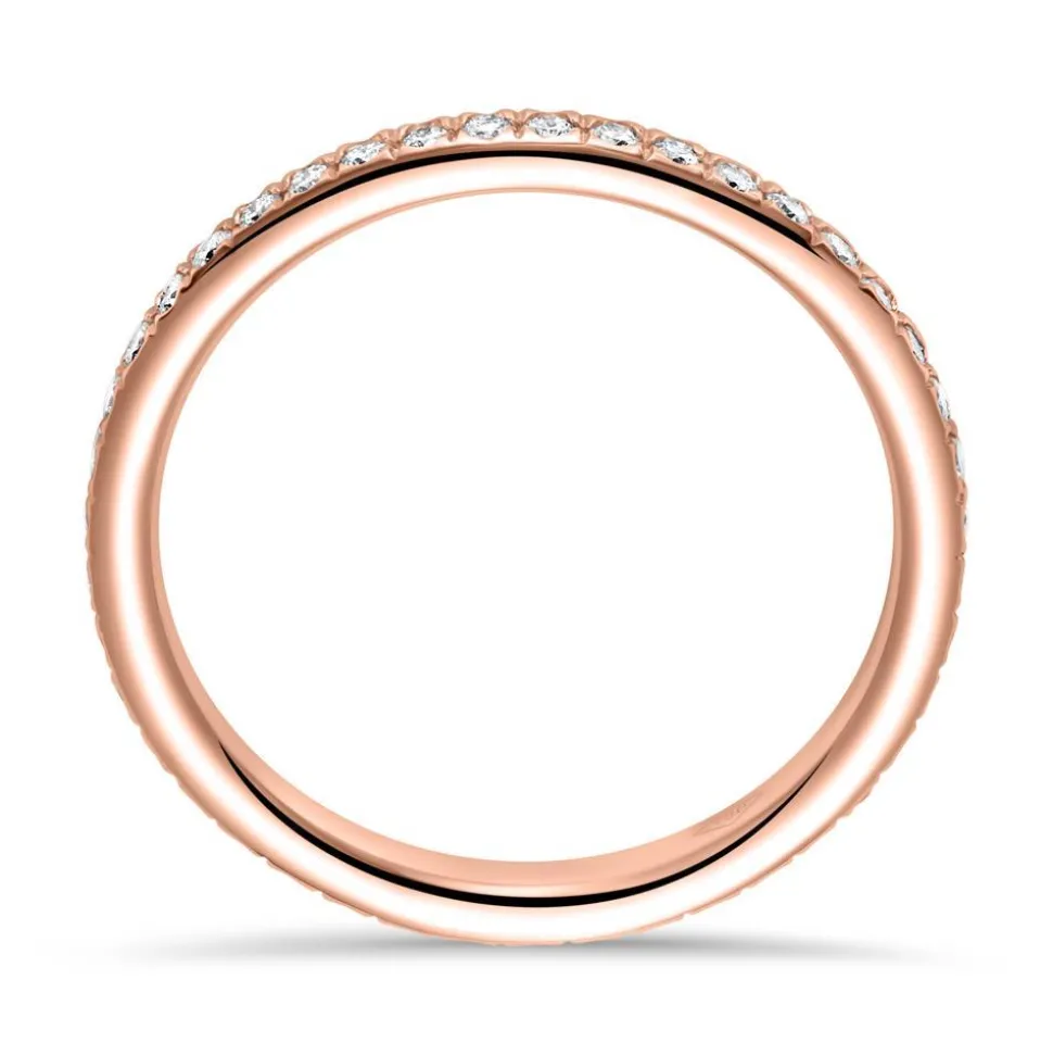 Die 43 Diamanten (ca. 0,42 ct.) im Brillantschliff, die die gesamte Ringschiene zieren, sind bei diesem Ring das Highlight und durch ihr reinweißes Funkeln wird er alle Blicke auf sich ziehen. Dazu beitragen wird auch das 18-karätige Roségold und die exzellente Verarbeitung. Der klassische Eternity-Ring eignet sich hervorragend als Geschenk für eine geliebte Person, der Sie zeigen möchten, wie viel Sie Ihnen bedeutet. Die Farbe der Diamanten ist klassifiziert als Feines Weiß (Top Wesselton) und die Reinheit der Steine fällt in die Kategorie SI (small inclusions). Für uns ist es selbstverständlich, dass wir unsere Diamanten ausschließlich aus konfliktfreien Quellen beziehen.