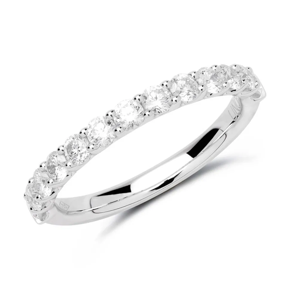 Bei dieser exklusiven Komposition erwartet Sie feinste Juwelierskunst – sowohl bei den verwendeten Materialien als auch bei der Verarbeitung. Bei uns wird jeder Diamantring von Hand geprüft, damit wir immer eine gleichbleibende Qualität gewährleisten können. Zudem stammen die Diamanten ausschließlich aus konfliktfreien Quellen. In die Pavéfassungen aus 750er Weißgold sind 13 Diamanten (ca. 0,66 ct.) im Brillantschliff eingearbeitet. Somit zieren sie die Hälfte des Ringes. Die Farbe der verarbeiteten Diamanten ist klassifiziert als Feines Weiß (Top Wesselton) und die Reinheit der Steine fällt in die Kategorie SI (small inclusions). Zudem ist der Ring rhodiniert und somit anlaufgeschützt.