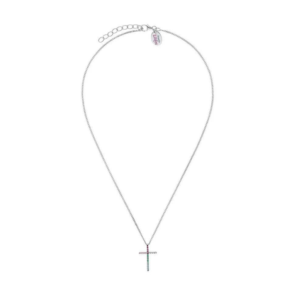 Symbolstark – das ist diese Halskette für Mädchen. Sie besteht aus rhodiniertem Sterlingsilber und besitzt als Anhänger ein Kreuz. Dieses ist mit Zirkonia in Fuchsia, Hellrosa, Grün und Hellblau besetzt. Geschlossen wird die längenverstellbare Kette mit einem klassischen Karabiner.