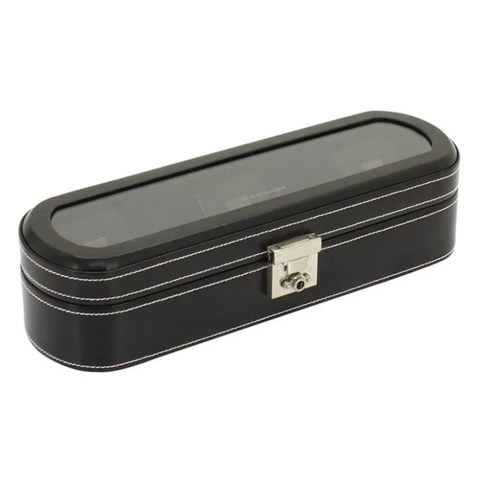 Wenn man erst mal über eine gewisse Sammlung an Armbanduhren und Chronographen verfügt, stellt sich nicht selten die Frage, wie man sie am besten aufbewahren und vor Staub, Kratzern und Schmutz schützen kann. Die Lösung? Ein Uhrenkasten! Dieser hier ist aus schwarzem Leder gefertigt, bietet Platz für bis zu 5 Uhren und ist abschließbar. Zudem besitzt Schloss, weiße Kontrastnähte und abgerundete Kanten. Dank der großen Sichtscheibe haben Sie Ihre Uhren alle im Blick und sofort griffbereit und können sich überlegen, welche am besten zu Ihrem jeweiligen Outfit passt.