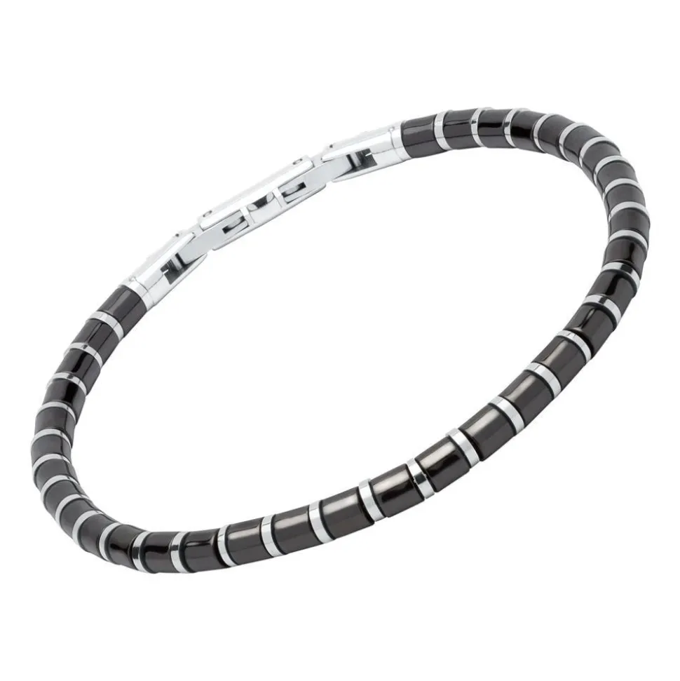 Auf der filigranen Ankerkette reihen sich abwechselnd schwarzglänzende, zylinderförmige Elemente aus IPB-beschichtetem Edelstahl und silberglänzende, flache Edelstahlelemente aneinander. Dadurch entsteht eine unaufgeregte Optik, die sowohl zu einem angesagten Streetstyle als auch zu einem eleganteren Look passt – Sie werden begeistert sein, wie gut es sich Ihrem jeweiligen Outfit anpassen wird. Das lässige Armband kann von Frauen und Männern gleichermaßen getragen werden. Durch das herausnehmbare Element kann das Armband in der Weite reguliert werden.