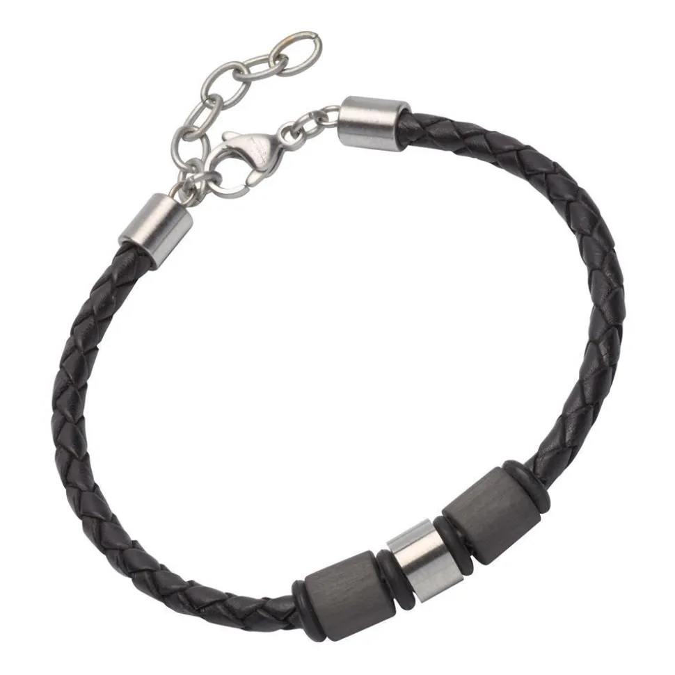 Dieses markante Armband aus schwarzem Leder mit zylinderförmigem Edelstahlbead und weiteren Schmuckelementen ist ideal dazu geeignet, um einen Look mit dem angesagten Casual Style zu unterstreichen. Das Highlight des Armschmucks ist die silbern glänzende Edelstahlperle, welche von zwei schwarzen Beads gerahmt wird. Die eingearbeiteten Stopper sorgen dafür, dass die Zierelemente nicht verrutschen. Verschlossen wird das Lederarmband mit einem praktischen Karabiner und durch das Verlängerungskettchen kann die individuelle Tragelänge an das jeweilige Handgelenk angepasst werden.