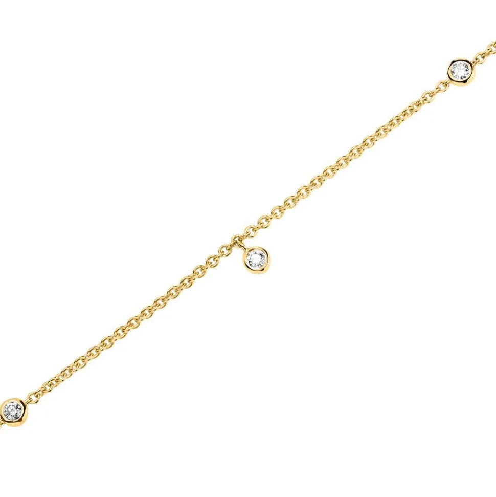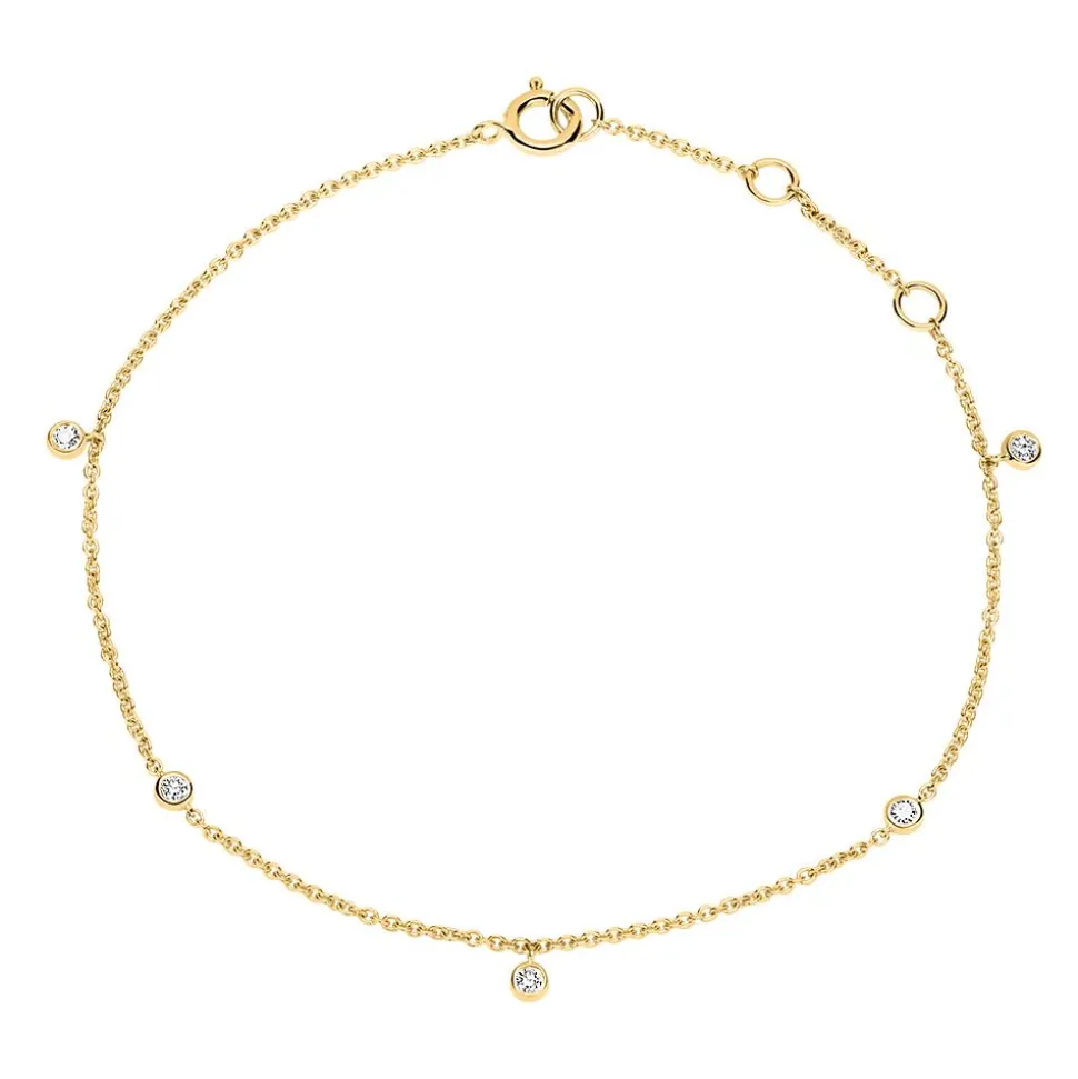 Grazil und stilvoll – das ist dieses Damenarmband aus 14-karätigem Gold. Es wird insgesamt von 5 zargengefassten Diamanten (ca. 0,10 ct.) geziert. Alle verarbeiteten Diamanten sind klassifiziert als Feines Weiß (Top Wesselton) und die Reinheit fällt in die Kategorie SI (small inclusions). Für uns ist es selbstverständlich, dass wir unsere Diamanten ausschließlich aus konfliktfreien Quellen beziehen.