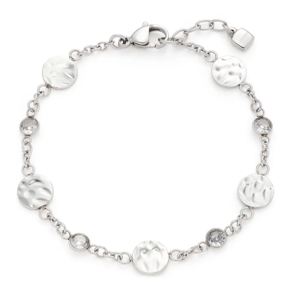Stilvoll und modern – das ist dieses Damenarmband aus Edelstahl. Zwischen die Ankerkettenglieder sind im vorderen Bereich abwechselnd zargengefasste Schmuckkristalle und Plättchen in gehämmerter Optik eingearbeitet. Das Armband besitzt einen Karabinerverschluss und kann in der Länge angepasst werden.