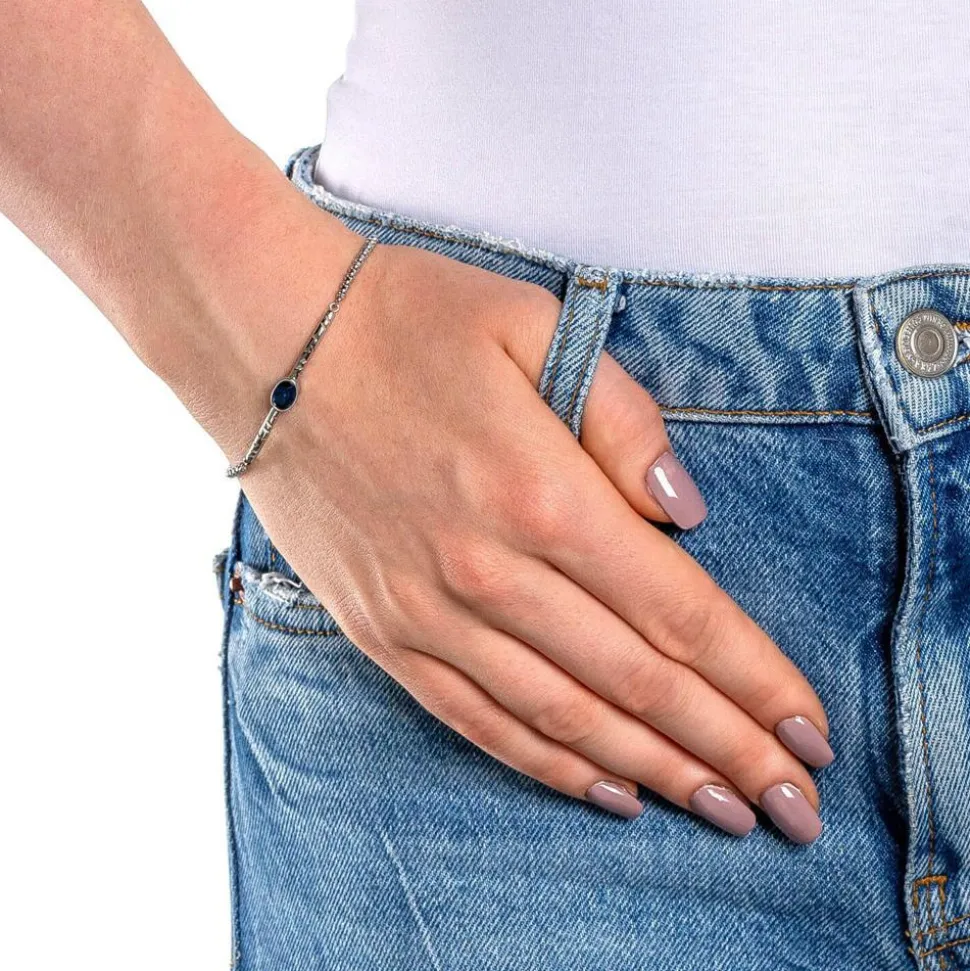 Dieses Damenarmband aus Edelstahl ist ein markanter und zugleich eleganter Blickfang! Zwischen die Venezianerkettenglieder ist ein Schmuckelement eingearbeitet, welches auf der Vorderseite von einem blauen, facettierten Glasstein geziert wird. Geschlossen wird das längenverstellbare Armband mit einem Karabiner.