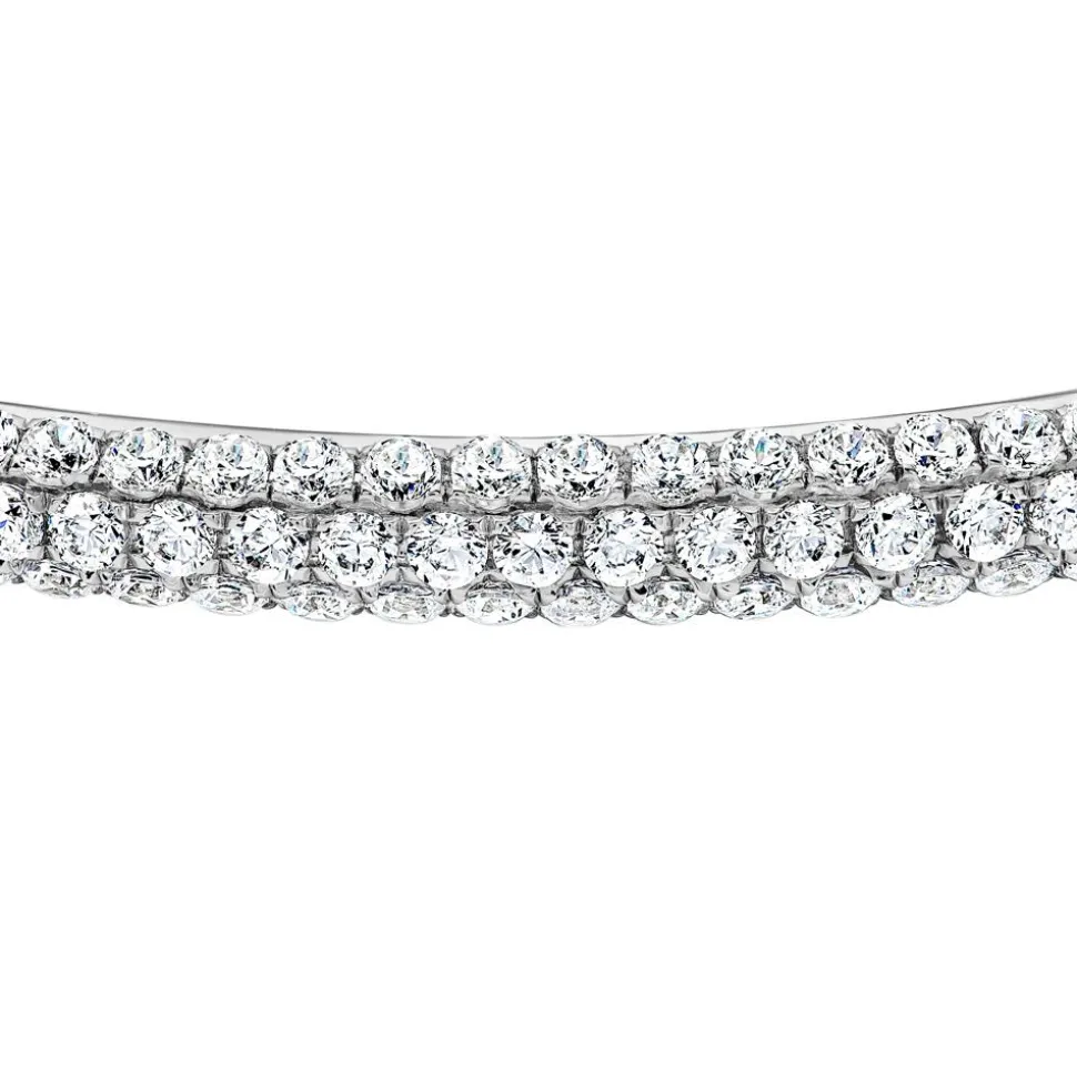 Dieses exklusive Diamantarmband zieht alle Blicke auf sich. Es ist in verschiedenen Legierungen verfügbar (585er und 750er Weißgold oder 950er Platin). Über das Drop-down-Feld kann die gewünschte Legierung ausgewählt werden. Für traumhaftes Funkeln sorgt der Diamantbesatz auf der Oberseite des Armbands. Die 97 Diamanten sind versetzt zueinander in drei nebeneinander verlaufenden Reihen platziert. Alle Diamanten besitzen einen Brillantschliff und insgesamt ca. 3,57 ct. Ihre Reinheit fällt in die Kategorie SI (small inclusions) und ihre Farbe ist als TW (Top Wesselton) klassifiziert. Zudem legen wir auch Wert auf ethische Aspekte, weshalb unsere Diamanten ausschließlich aus konfliktfreien Bezugsquellen stammen. Auf der Innenseite des Armbands befindet sich ein Cut-out-Muster. Die hintere Außenseite des Armbands kann auf Wunsch mit einem individuellen Text versehen werden. Zwei Sicherheitsbügel an den Seiten des Steckverschlusses sorgen für einen guten Halt.