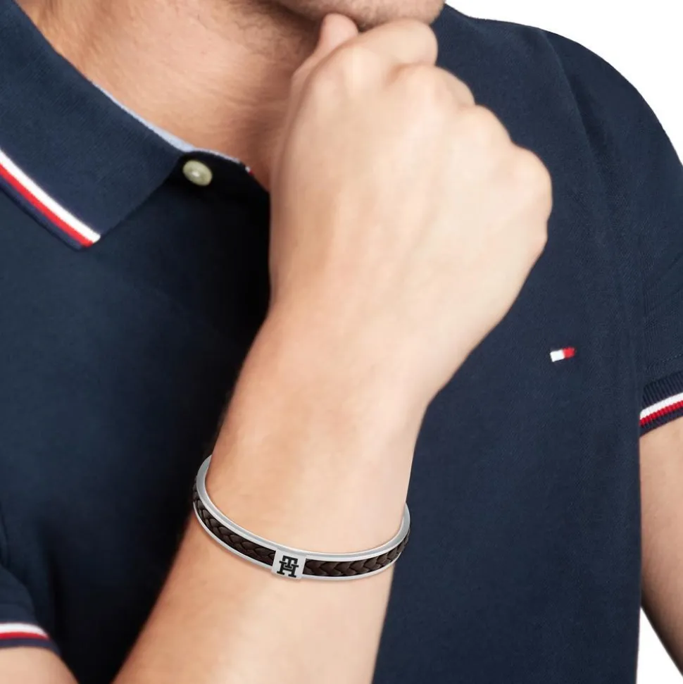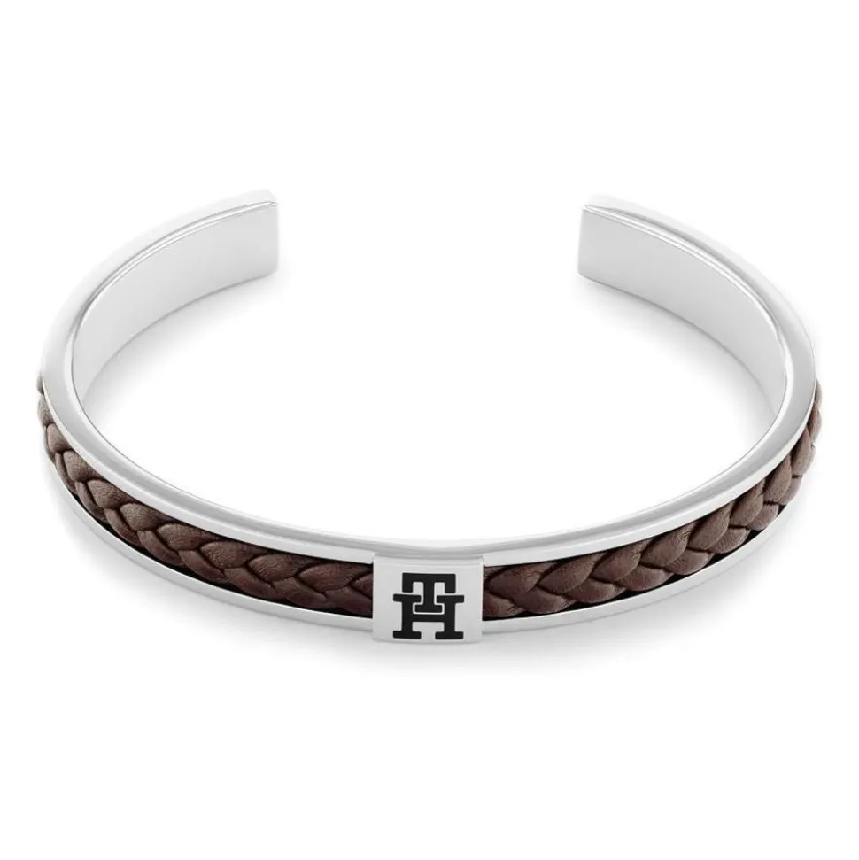 Ein lässiger Blickfang – das ist dieser C-förmige Armreif für Herren. Aus Edelstahl gefertigt, besitzt er auf der Vorderseite ein Inlay aus geflochtenem, braunem Leder. Auf einem Edelstahlplättchen befindet sich zudem das Markenmonogramm in schwarzer Emaille.