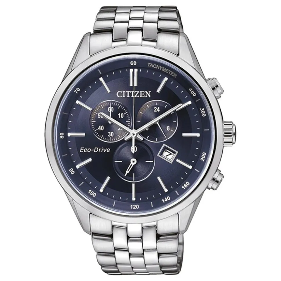 Dieser ansprechende Chronograph für Herren besteht aus kratzfestem Edelstahl und auf dem dunkelblauen Zifferblatt befindet sich eine Datums-, 24-Stundenanzeige und ein Tachymeter. Außerdem besitzt die Armbanduhr eine praktische Stoppuhr. Das zuverlässige Quarzwerk wird mit Sonnen- oder künstlichem Licht betrieben (Eco-Drive-Antrieb), wodurch ein Batteriewechsel nicht mehr nötig ist. Sie ist bis zu einem Druck von 10 bar wasserdicht und wird mit einer Faltschließe geschlossen.