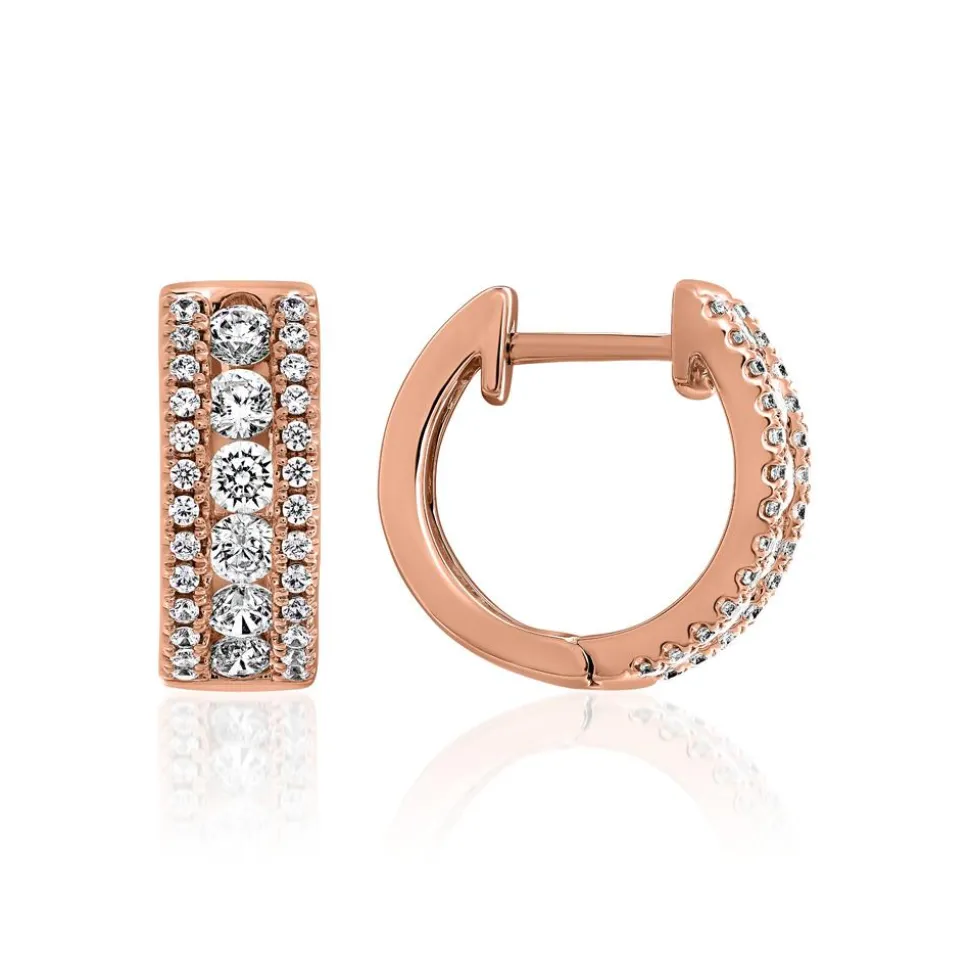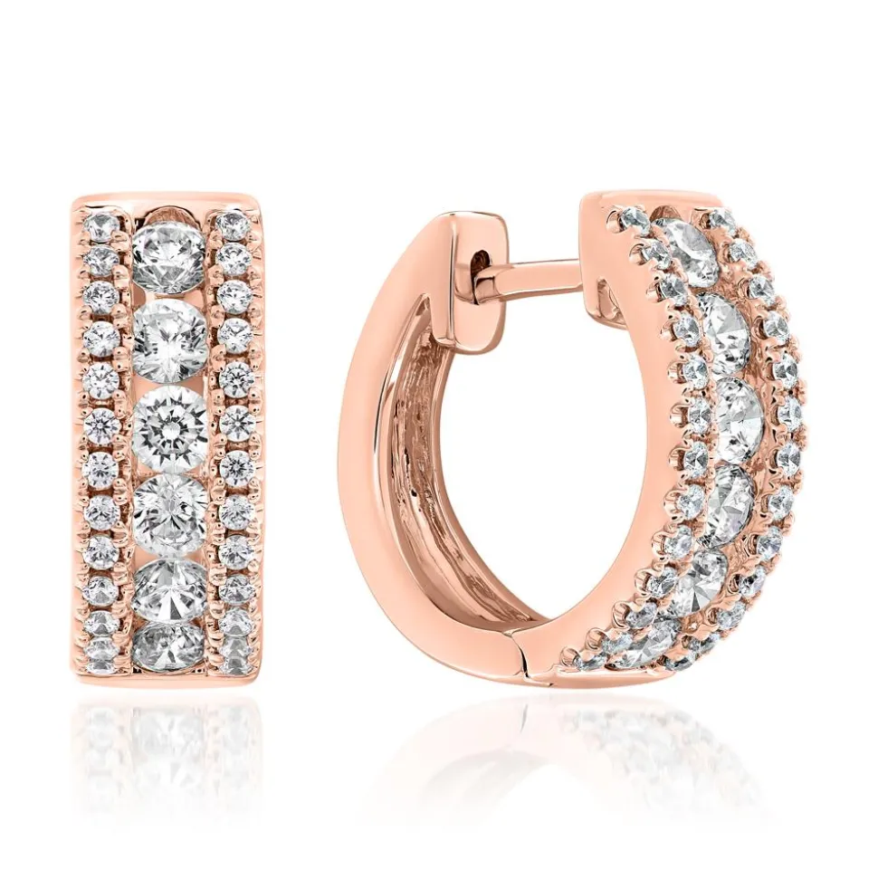 Exklusive Schönheiten – das sind diese Damen-Creolen, die wahlweise aus 585er (14 Karat) oder 750er (18 Karat) Roségold gefertigt sind. Bitte die gewünschte Legierung im Drop-down-Feld wählen. Jede Creole wird auf der vorderen Hälfte von einem Band größerer Diamanten im Brillantschliff geziert, die auf beiden Seiten von kleineren Diamanten gerahmt werden (Gesamtanzahl für beide Creolen: 64; ca. 0,70 ct.; DEF/VVS-VS). Bei den Diamanten handelt es sich um im Labor herstellte Steine. Diese bestehen, wie natürliche Diamanten, aus Kohlenstoff und besitzen auch sonst alle Eigenschaften eines abgebauten Diamanten, sind aber ressourcenschonender. Der Ohrschmuck verfügt über ein Brilladia-Zertifikat.