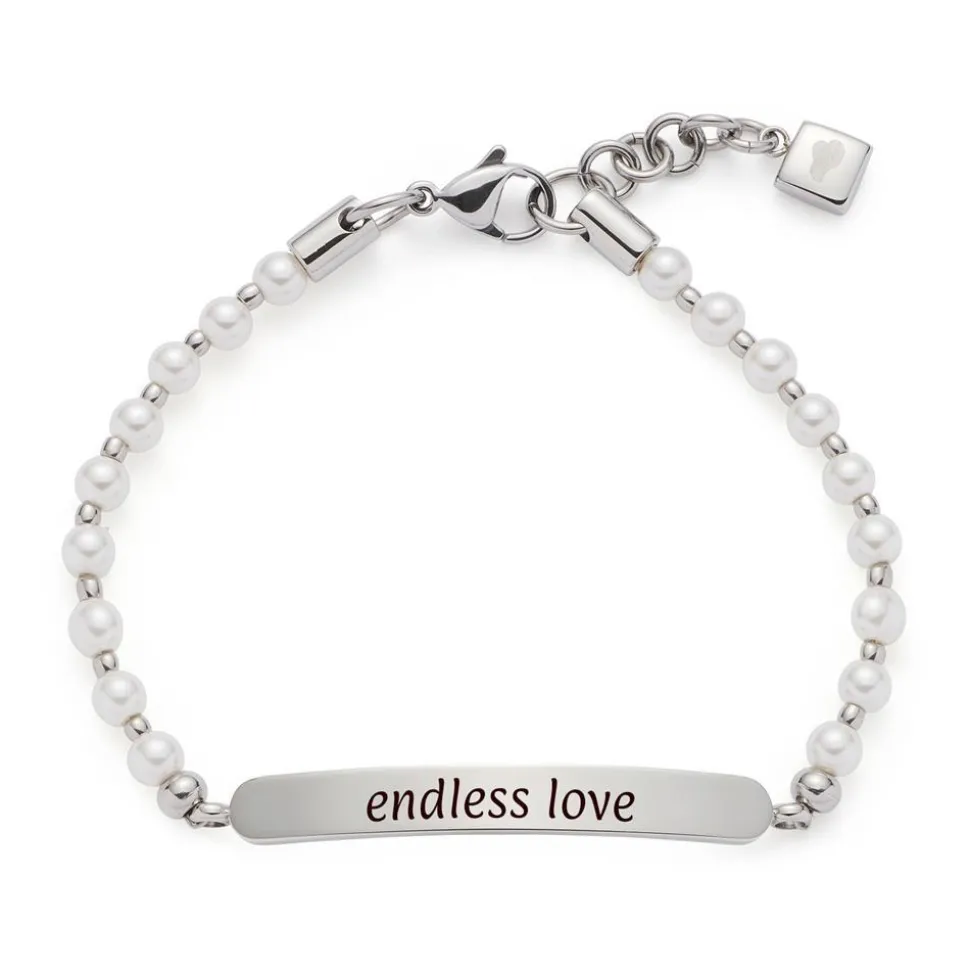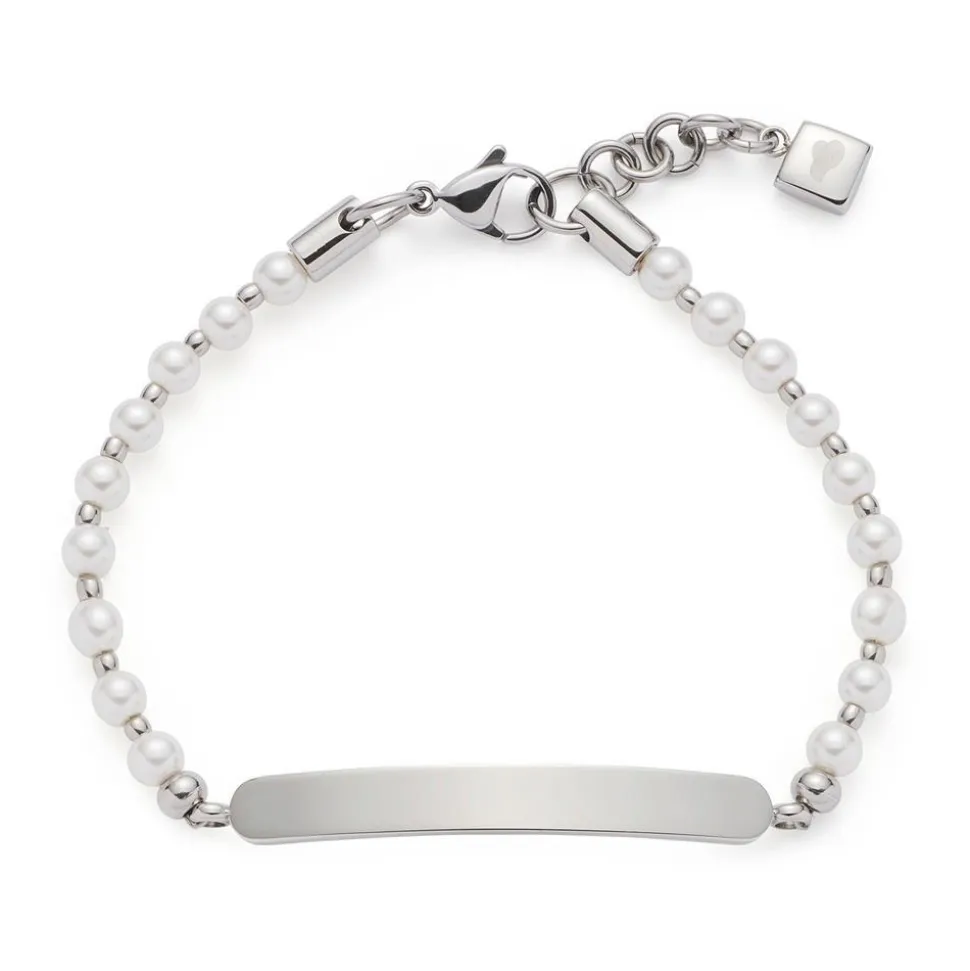 Elegant und personalisierbar – das ist dieses Armband. Es besteht aus Edelstahl und wird von schimmernden Perlen (imitiert) geziert. Zudem besitzt das Damenarmband eine Platte, welche auf beiden Seiten mit einer persönlichen Wunschgravur versehen werden kann. Geschlossen wird es mit einem klassischen Karabiner.