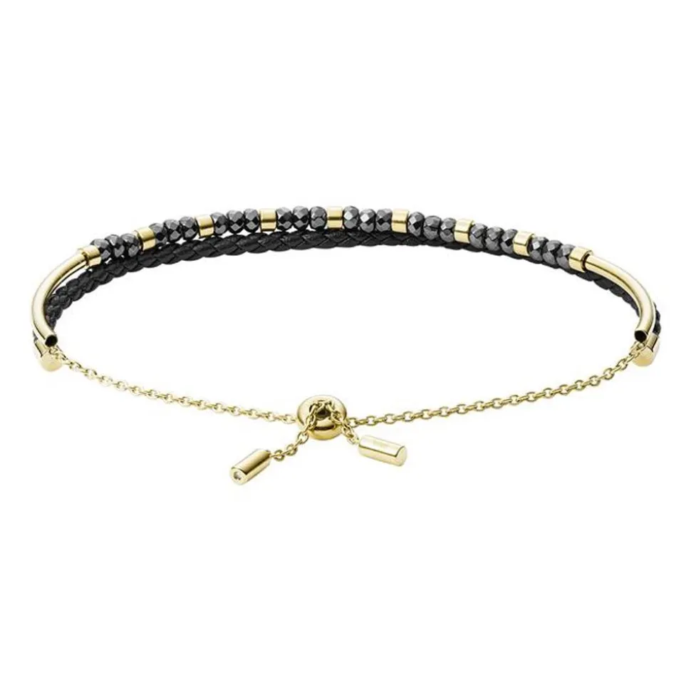 Dieses Armband ist die perfekte Kombination von moderner Lässigkeit und femininer Eleganz! Es ist zweireihig und die Basis besteht aus vergoldetem Edelstahl. Bei dem einen Band handelt es sich um ein geflochtenes Lederband in Schwarz. Das andere wird von goldglänzenden Schmuckelementen und grauen Glas-Schliffperlen geziert. Durch den praktischen Zugverschluss kann das Armband stufenlos an das jeweilige Handgelenk angepasst werden.