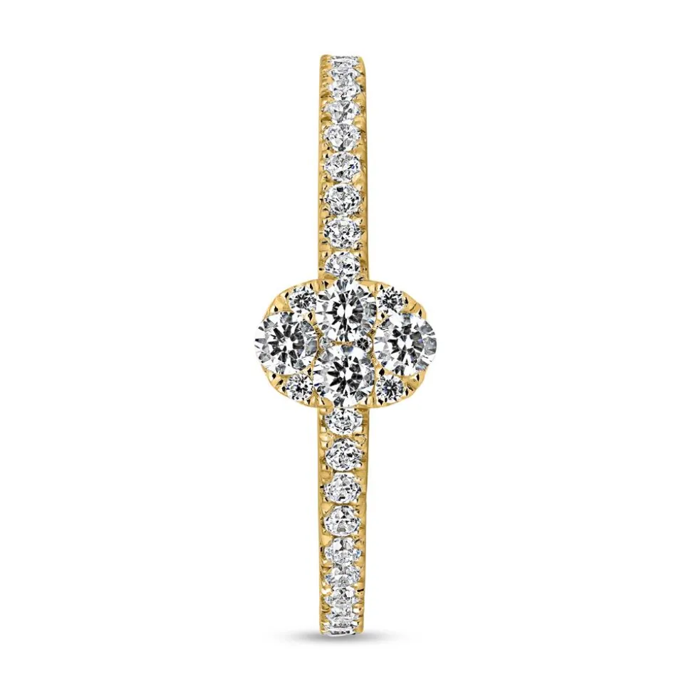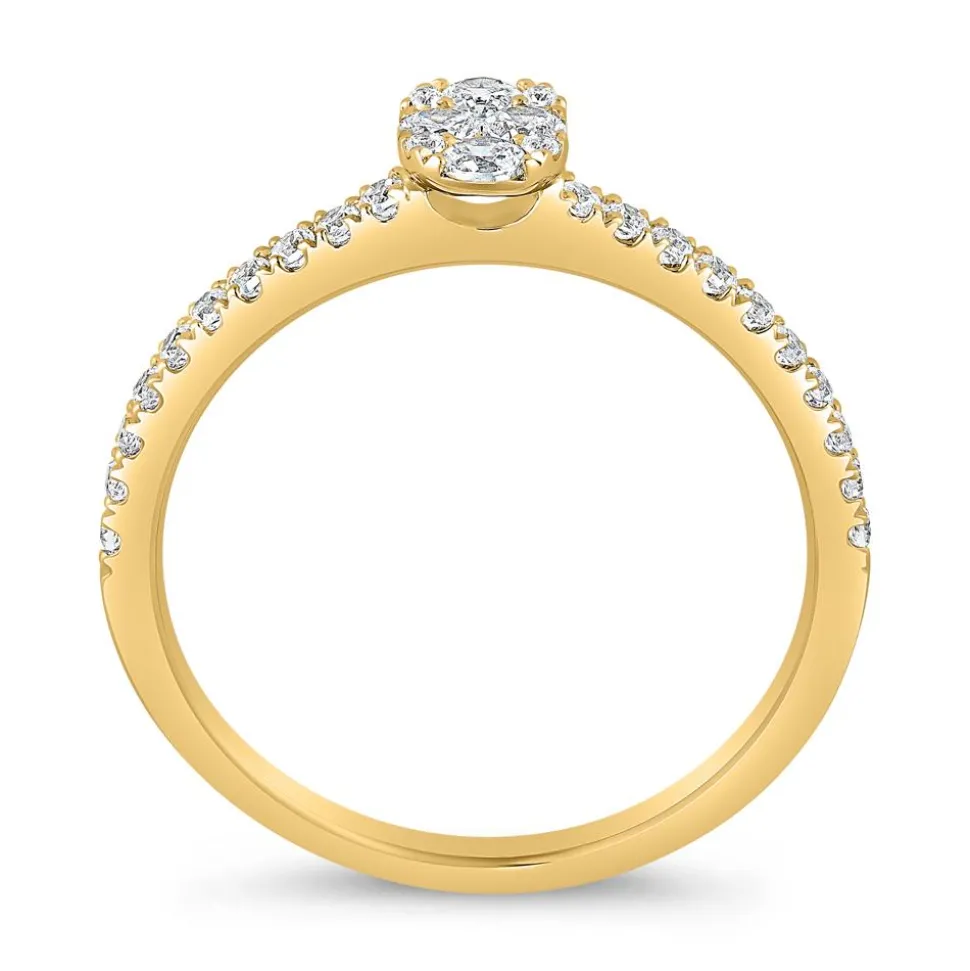 Ein stilvoller Diamantring aus edlem Gelbgold. Der Ring ist entweder in einer 14-karätigen oder einer 18-karätigen Legierung erhältlich. Die gewünschte Legierung kann bequem über das Drop-down-Feld ausgewählt werden. Der ovale Ringkopf ist mit einem Pavé aus funkelnden Diamanten besetzt, das von weiteren Brillanten in Krappenfassungen auf der Vorderseite der Ringschiene begleitet wird. Insgesamt befinden sich 30 Diamanten mit einem Gesamtgewicht von ca. 0,35 ct. auf dem Ring. Die Brillanten beeindrucken durch ihre Farbe „Top Wesselton“ und die Reinheit „small inclusions“ und stammen aus konfliktfreien Quellen. Eine Gravur auf der Innenseite kann hinzugefügt werden.