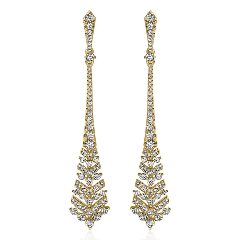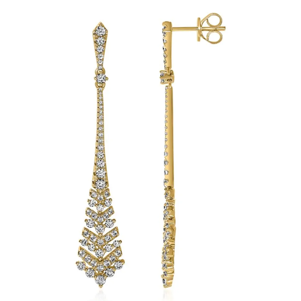 Ein opulentes Funkeln – damit begeistern diese Ohrstecker in Ohrhänger-Optik! Sie können wahlweise in 585er oder 750er Gelbgold bestellt werden. Bitte die gewünschte Legierung im Drop-down-Feld auswählen. Insgesamt werden die Stecker von 118 Diamanten im Brillantschliff (ca. 1,79 ct.) geziert. Die Farbe dieser fällt in die Kategorie „Top Wesselton“, die Reinheit ist mit „small inclusions“ klassifiziert und sie stammen selbstverständlich aus konfliktfreien Quellen.