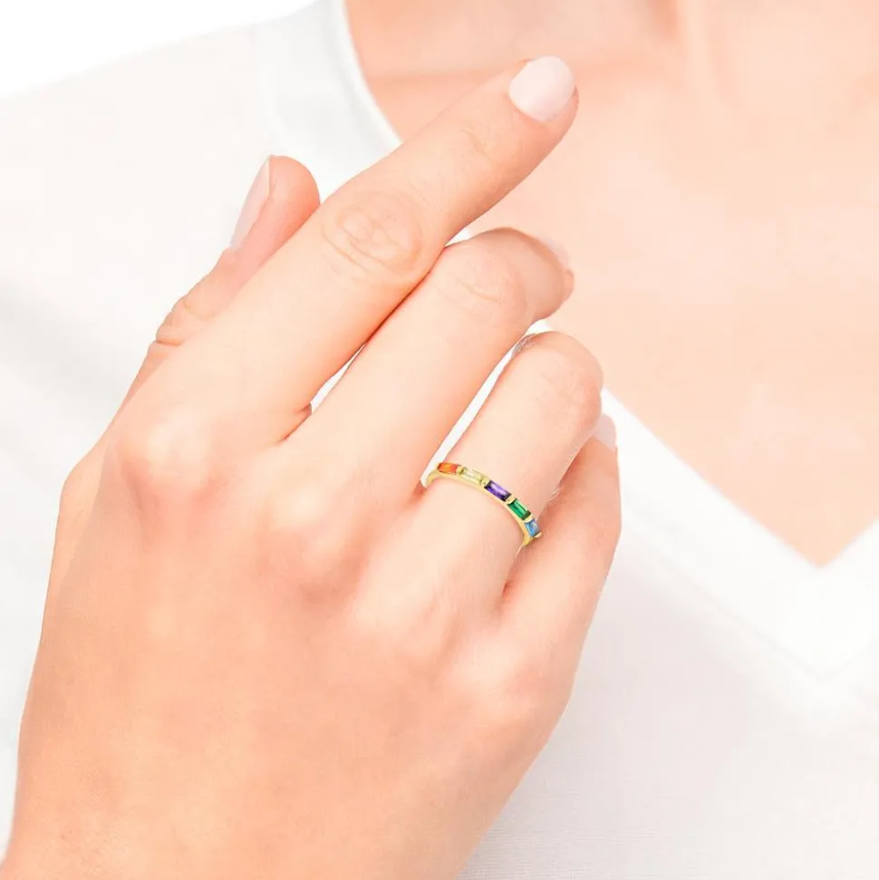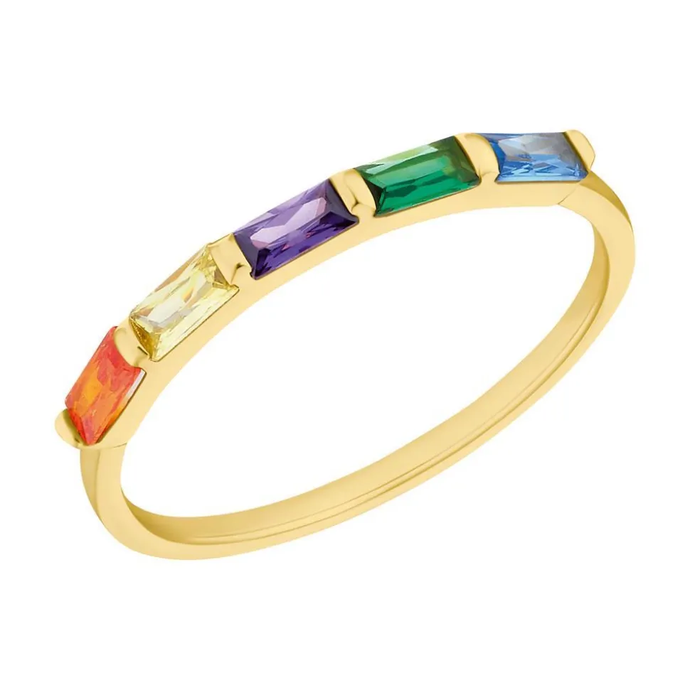 Ein farbenfroher Blickfang – das ist dieser Ring für Damen. Er ist aus vergoldetem Sterlingsilber gefertigt und wird auf der Oberseite von nebeneinander gereihten Zirkoniasteinen in verschiedenen Farben geziert. Die Zirkoniasteine in Orange, Gelb, Lila, Grün und Blau besitzen alle einen Baguetteschliff.