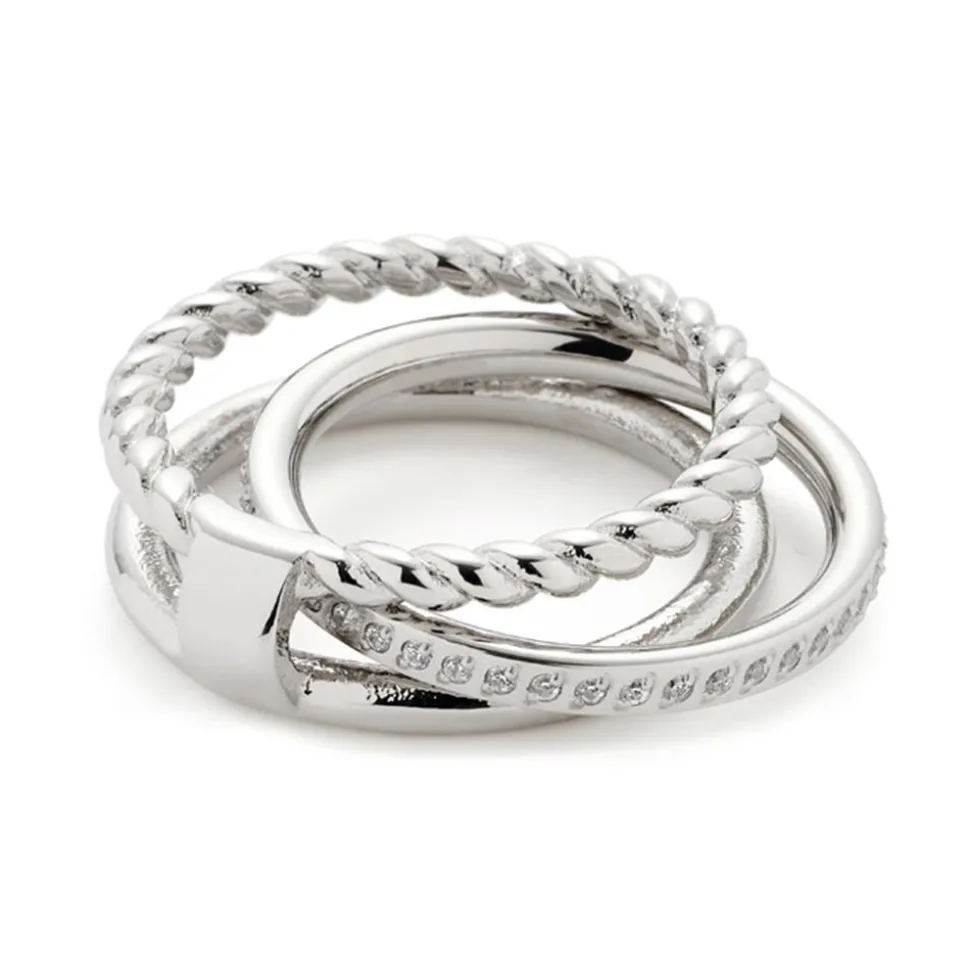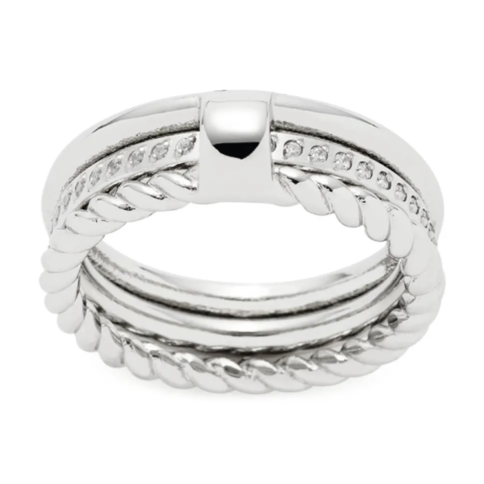 Dieses Ringset für Damen ist aus Edelstahl gefertigt und besitzt ein trendstarkes Design. Das Set besteht aus zwei unterschiedlichen Ringen, die sowohl einzeln als auch zusammen getragen werden können. Ein Ring besitzt zwei runde Ringschienen, die durch eine Spange zusammengehalten werden. Während die eine Ringschiene poliert ist, weist die andere Ringschiene eine Kordel-Optik auf. Der zweite Ring besitzt eine flache Oberfläche, die durchgängig mit Zirkoniasteinen besetzt ist. Dieser kann in die Mitte des Doppelrings gesteckt werden.